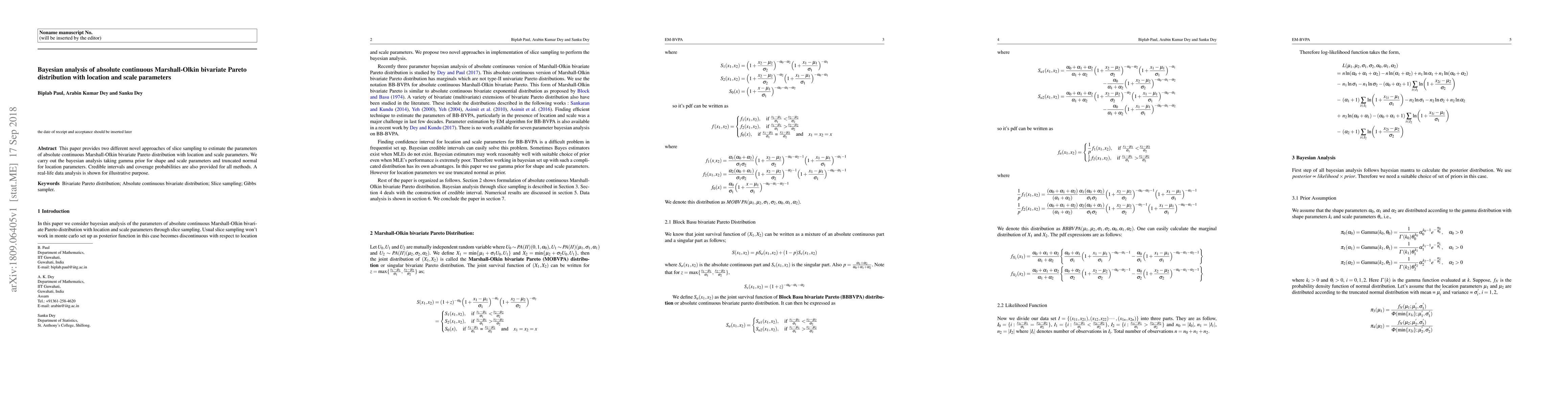 This paper provides two different novel approaches of slice sampling to estimate the parameters of absolute continuous Marshall-Olkin bivariate Pareto distribution with location and scale parameters. We carry out the bayesian analysis taking gamma prior for shape and scale parameters and truncated normal for location parameters. Credible intervals and coverage probabilities are also provided for all methods. A real-life data analysis is shown for illustrative purpose.