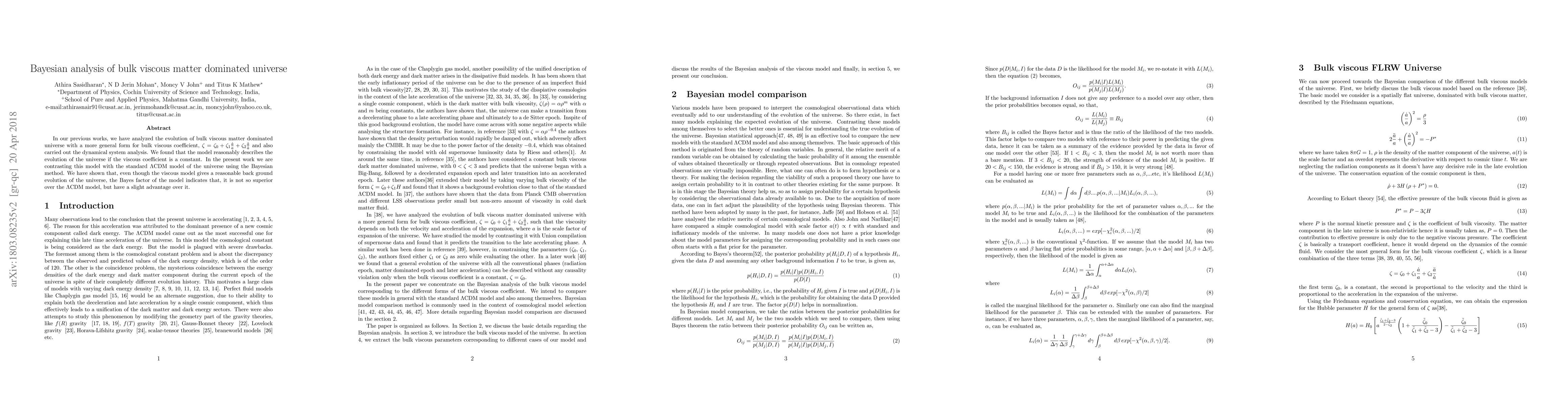 This paper contrasts a bulk viscous matter dominated universe model with the standard $\Lambda$CDM model using Bayesian analysis. While the viscous model provides a reasonable description of the universe's evolution, the Bayesian results show it is not significantly superior to the $\Lambda$CDM model, though it has a slight advantage.