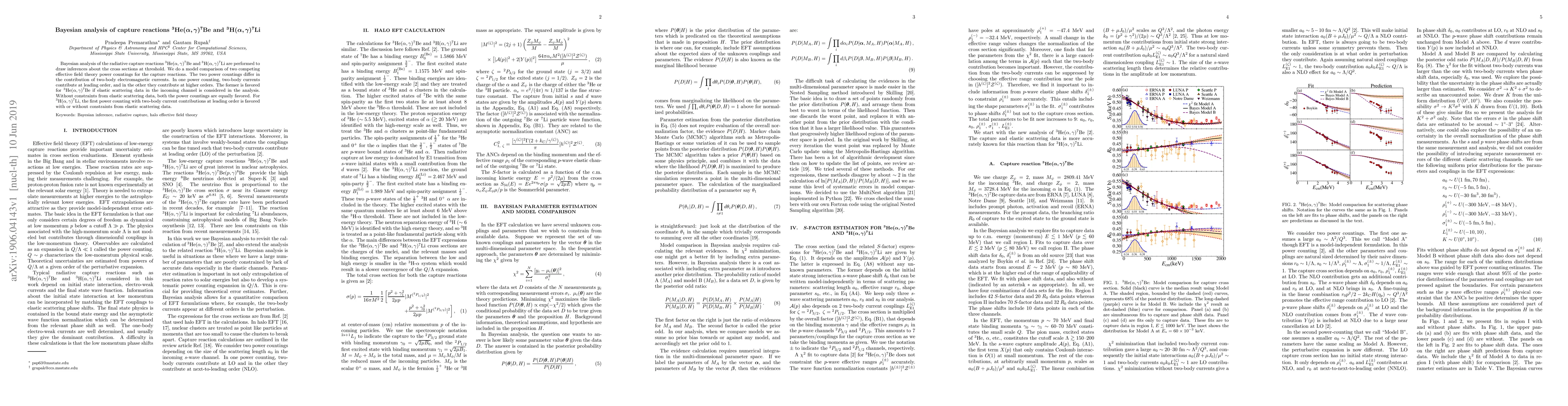 This paper uses Bayesian analysis to compare two effective field theory models for the radiative capture reactions $^3\mathrm{He}(\alpha,\gamma)^7\mathrm{Be}$ and $^3\mathrm{H}(\alpha,\gamma)^7\mathrm{Li}$, finding the former favors a model where two-body currents contribute at leading order when elastic scattering data is included, while the latter consistently favors this model regardless of such data.