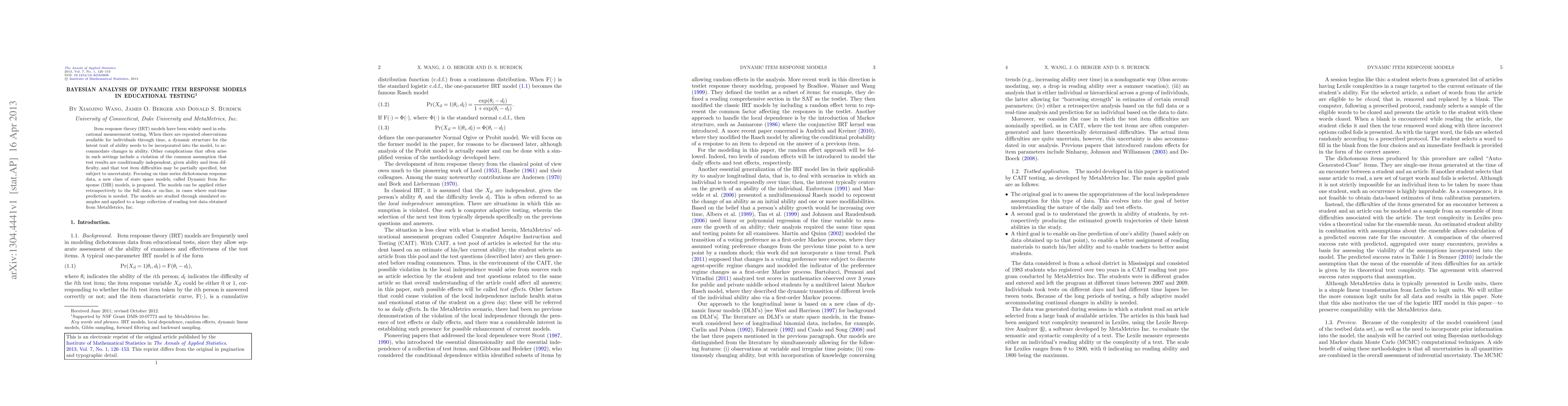 This paper proposes Dynamic Item Response (DIR) models to analyze time series dichotomous response data in educational testing, incorporating a dynamic structure for ability changes and addressing violations of conditional independence assumptions. The models are applied to a large dataset from MetaMetrics, Inc.