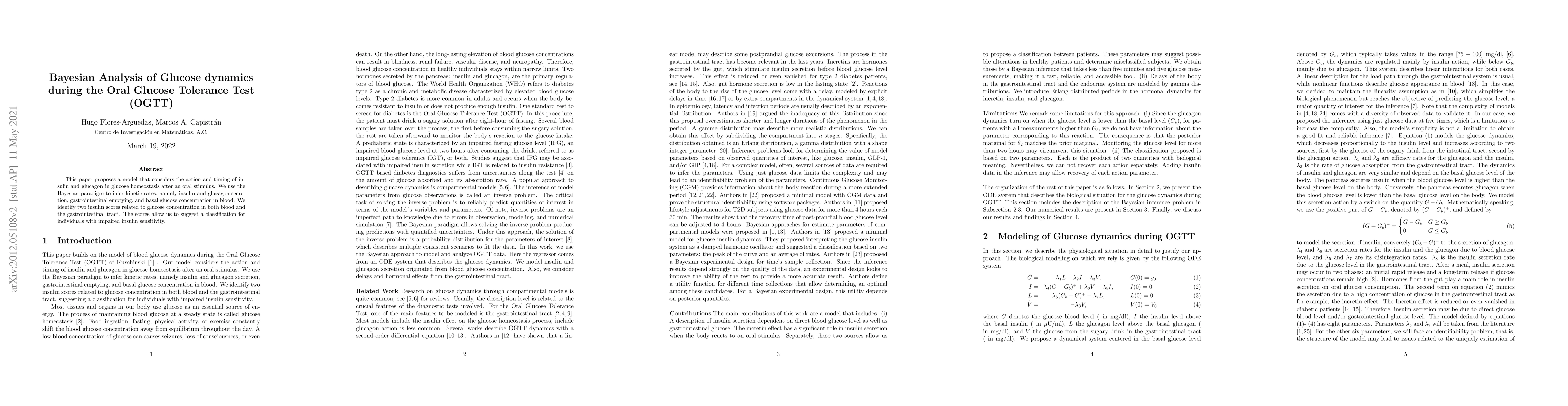 This paper proposes a Bayesian model to analyze glucose dynamics during an Oral Glucose Tolerance Test (OGTT), incorporating insulin and glucagon actions. It infers five parameters related to insulin and glucagon secretion, gastrointestinal emptying, and basal glucose levels, and uses two insulin indicators to classify patients with impaired insulin sensitivity.