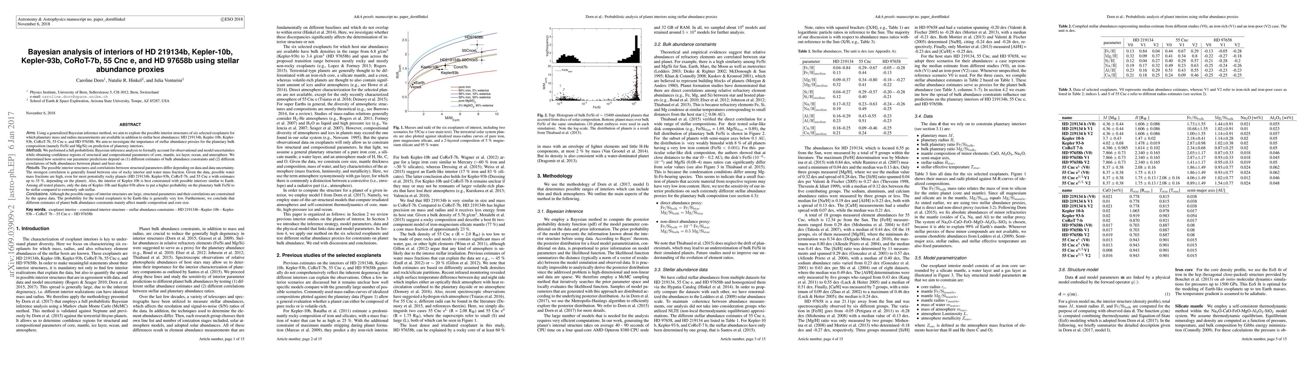 Using a generalized Bayesian inference method, we aim to explore the possible interior structures of six selected exoplanets for which planetary mass and radius measurements are available in addition to stellar host abundances: HD~219134b, Kepler-10b, Kepler-93b, CoRoT-7b, 55~Cnc~e, and HD~97658b. We aim to investigate the importance of stellar abundance proxies for the planetary bulk composition (namely Fe/Si and Mg/Si) on prediction of planetary interiors. We performed a full probabilistic Bayesian inference analysis to formally account for observational and model uncertainties while obtaining confidence regions of structural and compositional parameters of core, mantle, ice layer, ocean, and atmosphere. We determined how sensitive our parameter predictions depend on (1) different estimates of bulk abundance constraints and (2) different correlations of bulk abundances between planet and host star. [...] Although the possible ranges of interior structures are large, structural parameters and their correlations are constrained by the sparse data. The probability for the tested exoplanets to be Earth-like is generally very low. Furthermore, we conclude that different estimates of planet bulk abundance constraints mainly affect mantle composition and core size.