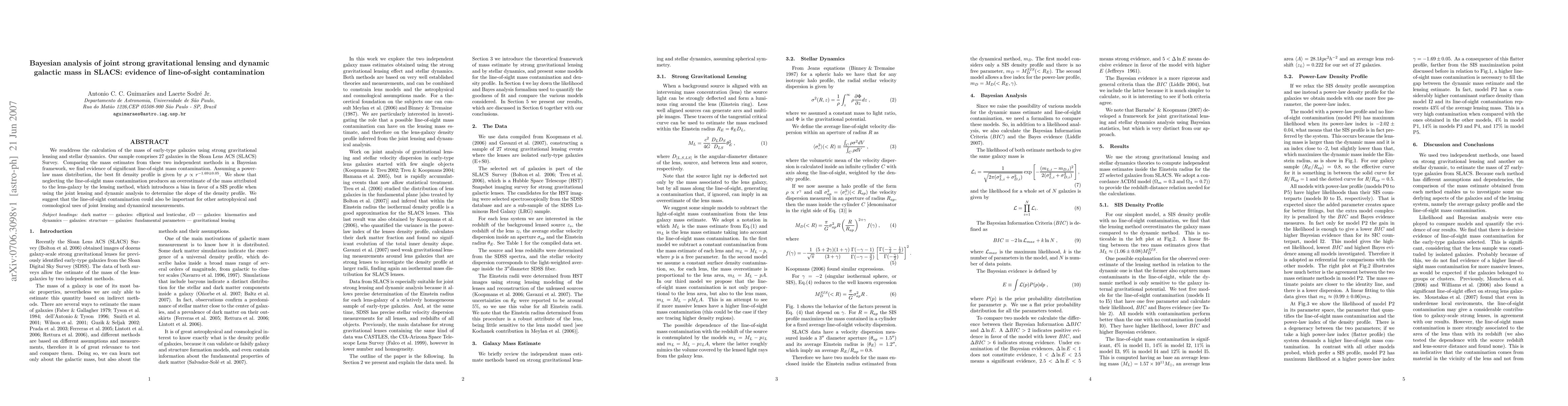 We readdress the calculation of the mass of early-type galaxies using strong gravitational lensing and stellar dynamics. Our sample comprises 27 galaxies in the Sloan Lens ACS (SLACS) Survey. Comparing the mass estimates from these two independent methods in a Bayesian framework, we find evidence of significant line-of-sight mass contamination. Assuming a power-law mass distribution, the best fit density profile is given by $\rho \propto r^{-1.69\pm0.05}$. We show that neglecting the line-of-sight mass contamination produces an overestimate of the mass attributed to the lens-galaxy by the lensing method, which introduces a bias in favor of a SIS profile when using the joint lensing and dynamic analysis to determine the slope of the density profile. We suggest that the line-of-sight contamination could also be important for other astrophysical and cosmological uses of joint lensing and dynamical measurements.