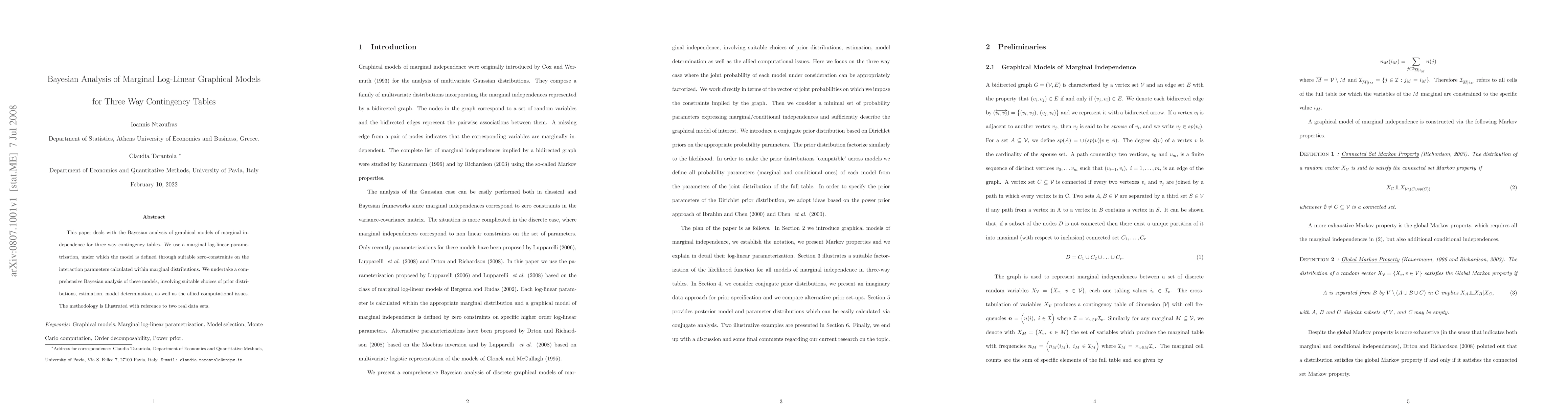 This paper presents a Bayesian analysis of marginal log-linear graphical models for three-way contingency tables, employing zero-constraints on interaction parameters within marginal distributions. The study includes prior selection, estimation, model determination, and computational strategies, demonstrated through two real data examples.