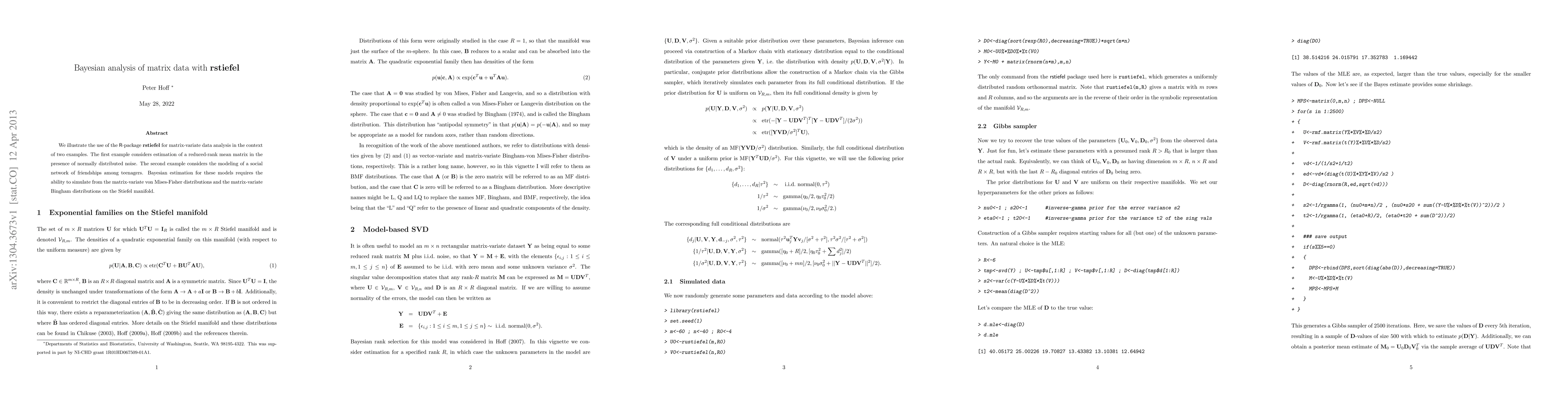 This paper demonstrates the application of the R-package "rstiefel" for Bayesian analysis of matrix-variate data through two examples: estimating a reduced-rank mean matrix with normally distributed noise and modeling social network friendships among teenagers, both utilizing matrix-variate von Mises-Fisher and Bingham distributions on the Stiefel manifold.
