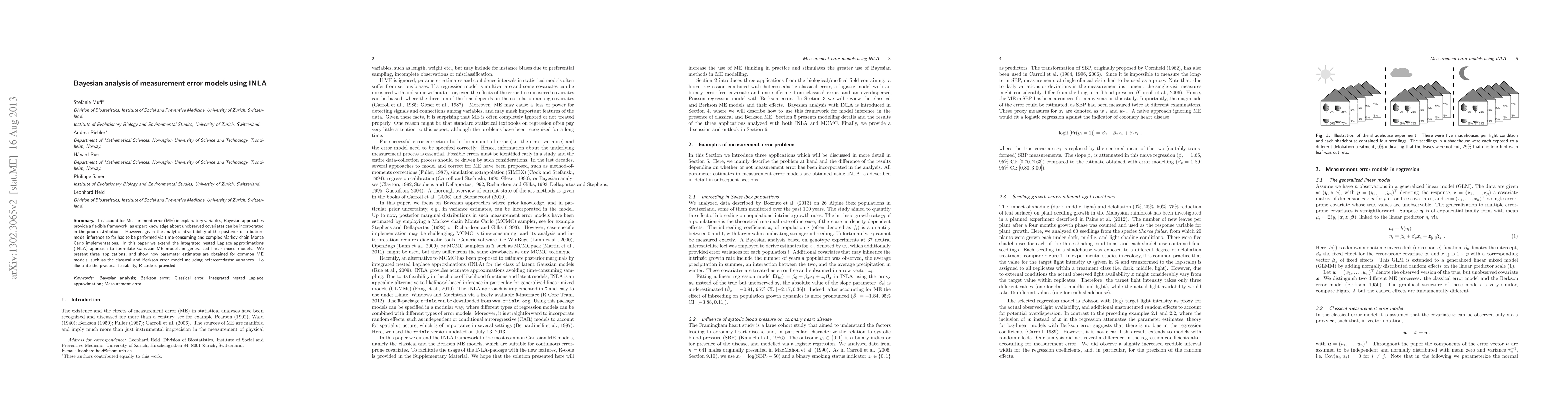 This paper extends the Integrated nested Laplace approximations (INLA) to Bayesian measurement error models, allowing for efficient parameter estimation without the need for complex Markov chain Monte Carlo methods. The approach is demonstrated through three applications, including classical and Berkson error models, and R-code is provided to illustrate practical implementation.