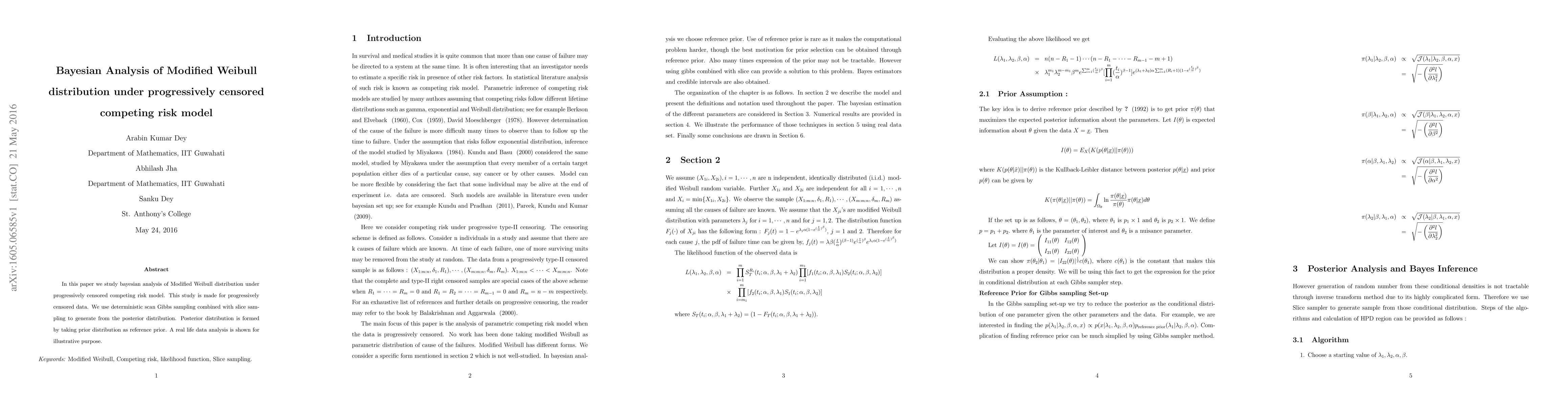 In this paper we study bayesian analysis of Modified Weibull distribution under progressively censored competing risk model. This study is made for progressively censored data. We use deterministic scan Gibbs sampling combined with slice sampling to generate from the posterior distribution. Posterior distribution is formed by taking prior distribution as reference prior. A real life data analysis is shown for illustrative purpose.