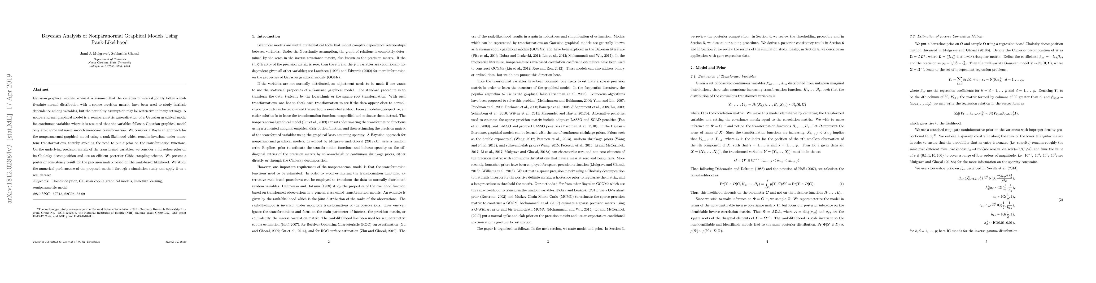 This paper proposes a Bayesian method for nonparanormal graphical models using rank-likelihood to avoid restrictive normality assumptions. It employs a horseshoe prior for the precision matrix and demonstrates its effectiveness through simulations and a real dataset.