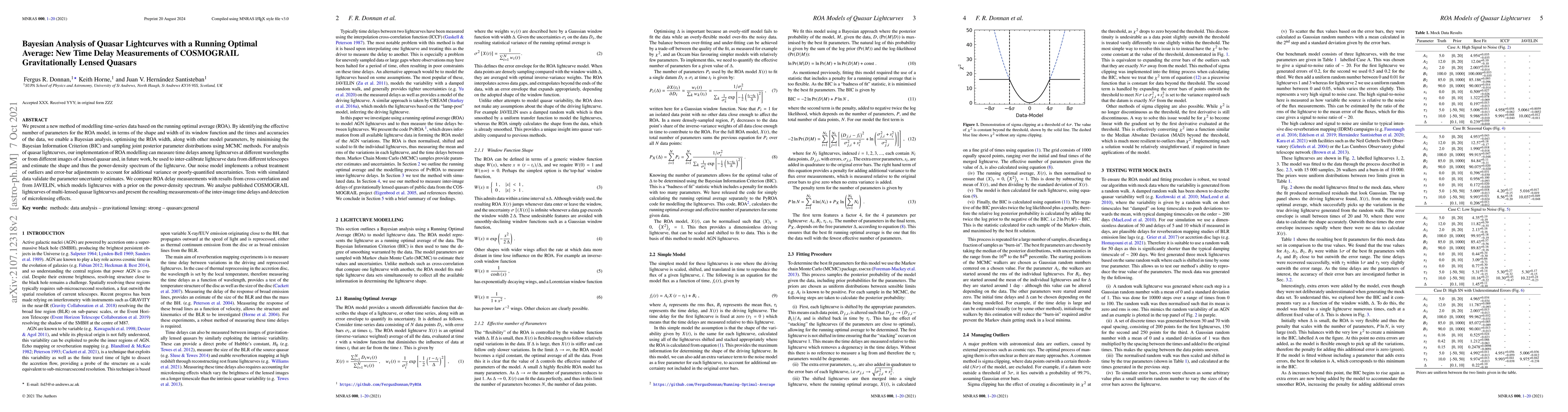 We present a new method of modelling time-series data based on the running optimal average (ROA). By identifying the effective number of parameters for the ROA model, in terms of the shape and width of its window function and the times and accuracies of the data, we enable a Bayesian analysis, optimising the ROA width, along with other model parameters, by minimising the Bayesian Information Criterion (BIC) and sampling joint posterior parameter distributions using MCMC methods. For analysis of quasar lightcurves, our implementation of ROA modelling can measure time delays among lightcurves at different wavelengths or from different images of a lensed quasar and, in future work, be used to inter-calibrate lightcurve data from different telescopes and estimate the shape and thus the power-density spectrum of the lightcurve. Our noise model implements a robust treatment of outliers and error-bar adjustments to account for additional variance or poorly-quantified uncertainties. Tests with simulated data validate the parameter uncertainty estimates. We compare ROA delay measurements with results from cross-correlation and from JAVELIN, which models lightcurves with a prior on the power-density spectrum. We analyse published COSMOGRAIL lightcurves of multi-lensed quasar lightcurves and present the resulting measurements of the inter-image time delays and detection of microlensing effects.