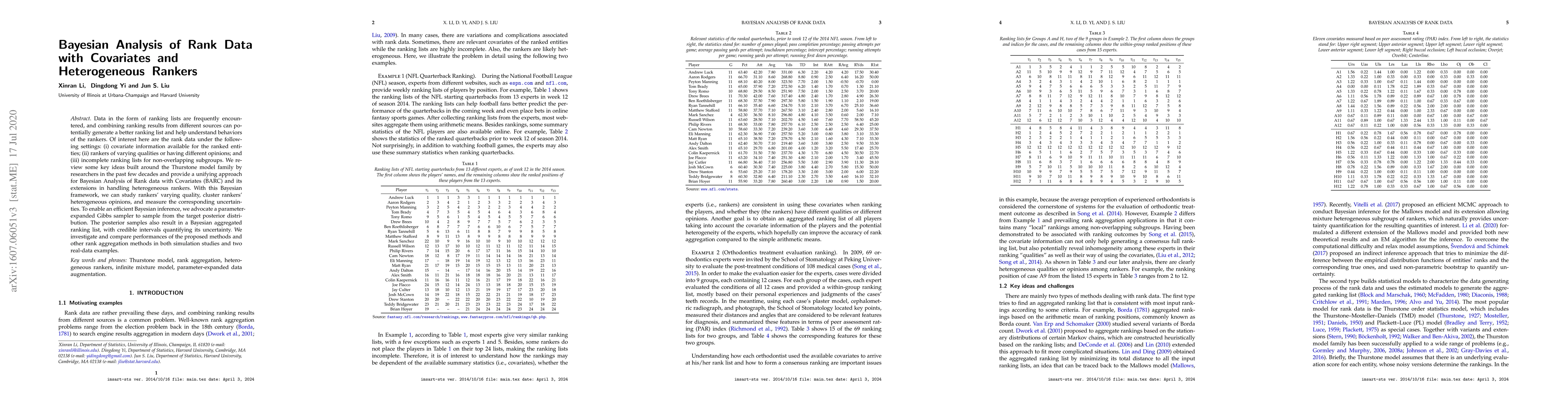 Data in the form of ranking lists are frequently encountered, and combining ranking results from different sources can potentially generate a better ranking list and help understand behaviors of the rankers. Of interest here are the rank data under the following settings: (i) covariate information available for the ranked entities; (ii) rankers of varying qualities or having different opinions; and (iii) incomplete ranking lists for non-overlapping subgroups. We review some key ideas built around the Thurstone model family by researchers in the past few decades and provide a unifying approach for Bayesian Analysis of Rank data with Covariates (BARC) and its extensions in handling heterogeneous rankers. With this Bayesian framework, we can study rankers' varying quality, cluster rankers' heterogeneous opinions, and measure the corresponding uncertainties. To enable an efficient Bayesian inference, we advocate a parameter-expanded Gibbs sampler to sample from the target posterior distribution. The posterior samples also result in a Bayesian aggregated ranking list, with credible intervals quantifying its uncertainty. We investigate and compare performances of the proposed methods and other rank aggregation methods in both simulation studies and two real-data examples.
