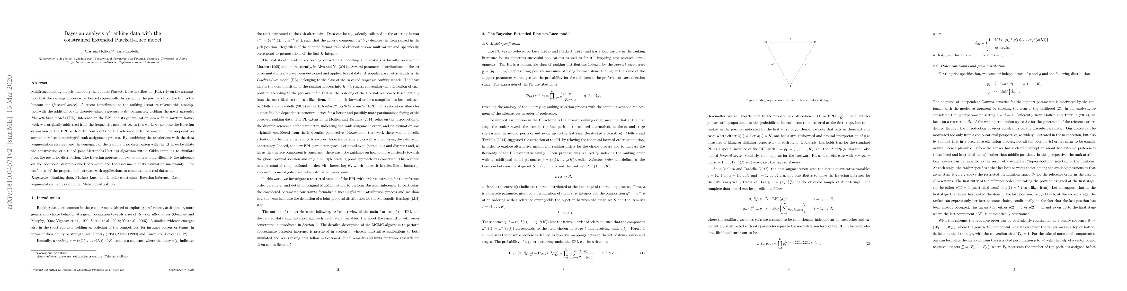 This paper proposes a Bayesian approach to estimate the Extended Plackett-Luce model with order constraints, utilizing data augmentation and a Metropolis-Hastings algorithm within Gibbs sampling. The method efficiently handles inference on the additional discrete-valued parameter and assesses its uncertainty, demonstrated through applications to both simulated and real datasets.