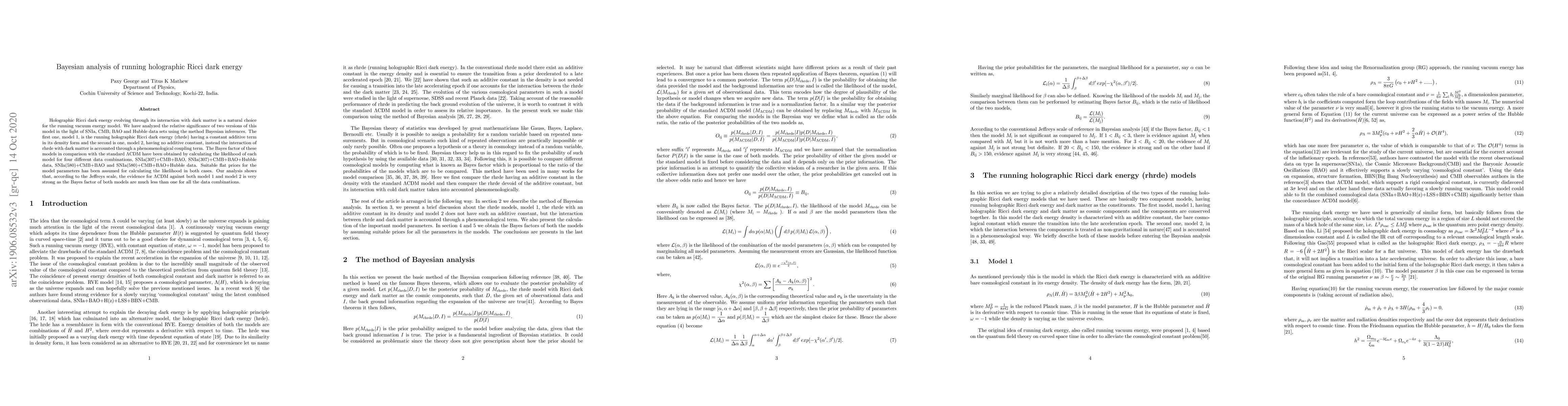 The paper presents a detailed Bayesian analysis framework for comparing holographic Ricci dark energy models with the standard ΛCDM model, using various cosmological datasets.