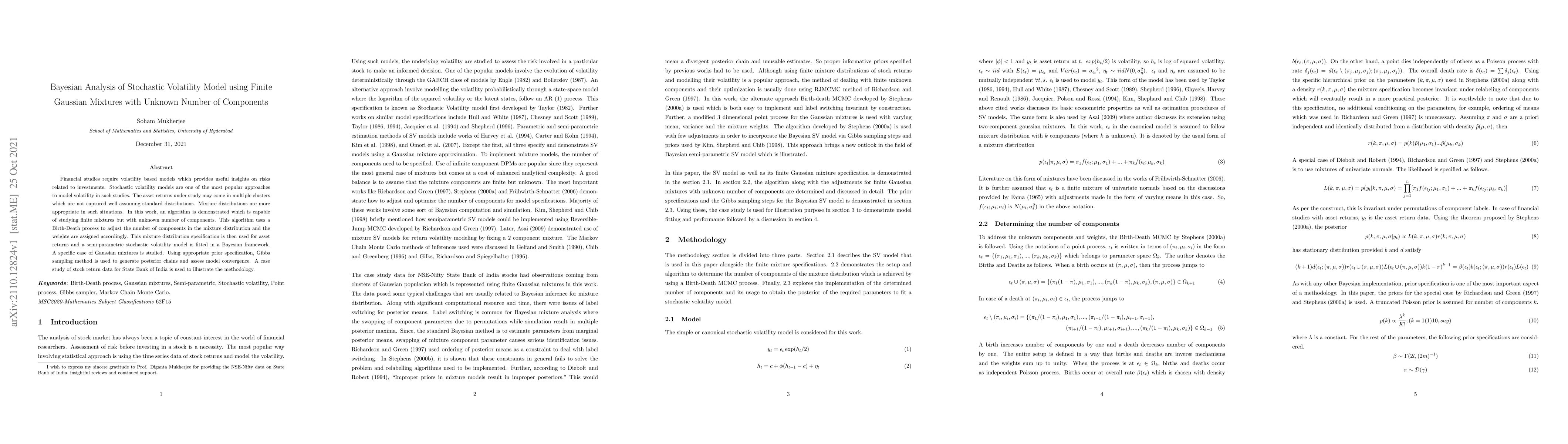 This paper develops a Bayesian algorithm for stochastic volatility modeling using finite Gaussian mixtures with an unknown number of components, employing a Birth-Death process to dynamically adjust the mixture components. The methodology is applied to stock return data of the State Bank of India to demonstrate the effectiveness of the approach.