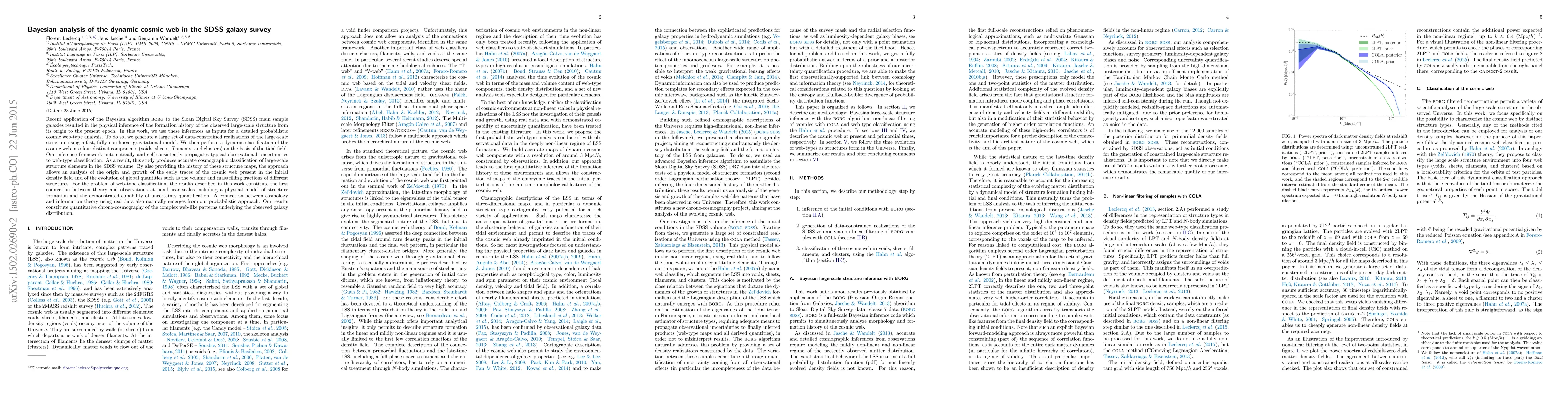 This paper employs Bayesian analysis and the BORG algorithm to infer the formation history of the large-scale cosmic web from SDSS galaxy survey data. It uses a non-linear gravitational model to classify the cosmic web into four components (voids, sheets, filaments, clusters) based on tidal fields, providing a probabilistic framework for uncertainty quantification and a detailed analysis of the cosmic web's evolution.