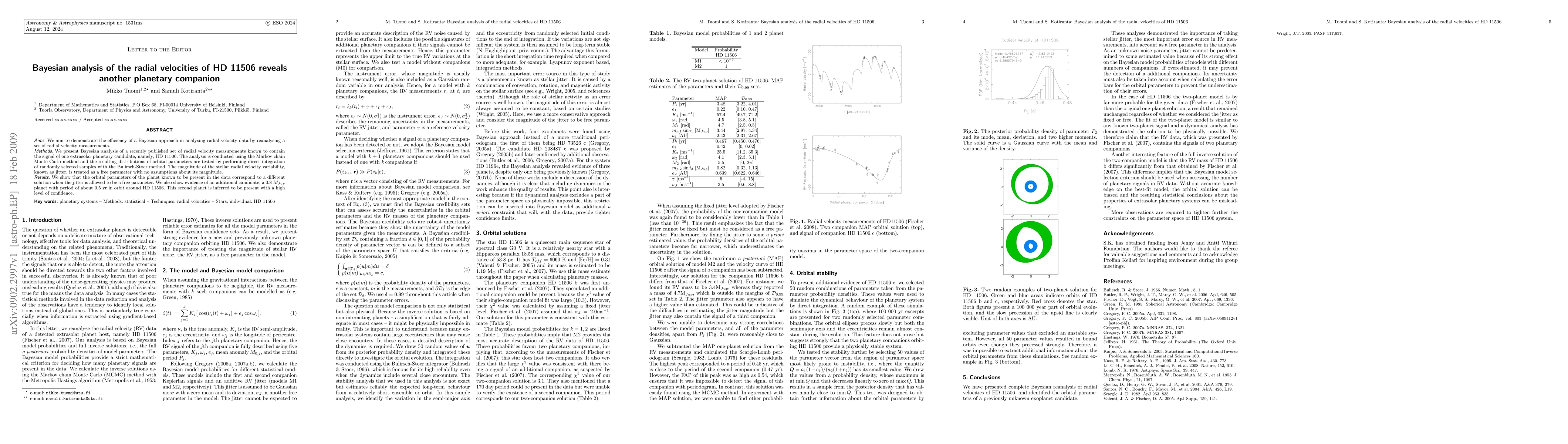 We aim to demonstrate the efficiency of a Bayesian approach in analysing radial velocity data by reanalysing a set of radial velocity measurements. We present Bayesian analysis of a recently published set of radial velocity measurements known to contain the signal of one extrasolar planetary candidate, namely, HD 11506. The analysis is conducted using the Markov chain Monte Carlo method and the resulting distributions of orbital parameters are tested by performing direct integration of randomly selected samples with the Bulirsch-Stoer method. The magnitude of the stellar radial velocity variability, known as jitter, is treated as a free parameter with no assumptions about its magnitude. We show that the orbital parameters of the planet known to be present in the data correspond to a different solution when the jitter is allowed to be a free parameter. We also show evidence of an additional candidate, a 0.8 MJup planet with period of about 0.5 yr in orbit around HD 11506. This second planet is inferred to be present with a high level of confidence.