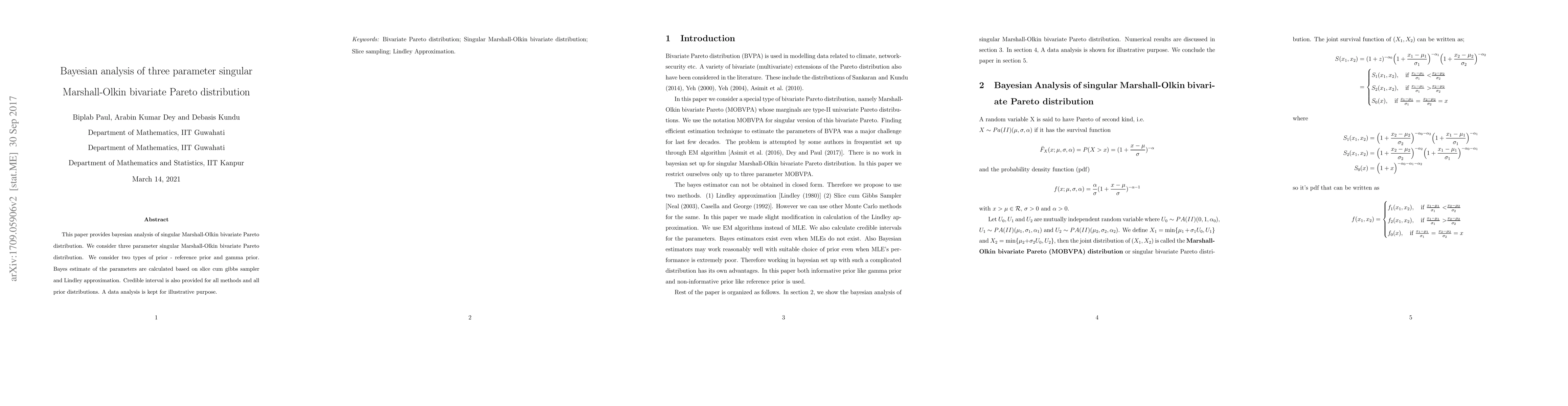 This paper conducts Bayesian analysis of the three-parameter singular Marshall-Olkin bivariate Pareto distribution using reference and gamma priors. It employs slice-cum-Gibbs sampling and Lindley approximation for parameter estimation and provides credible intervals for comparison.