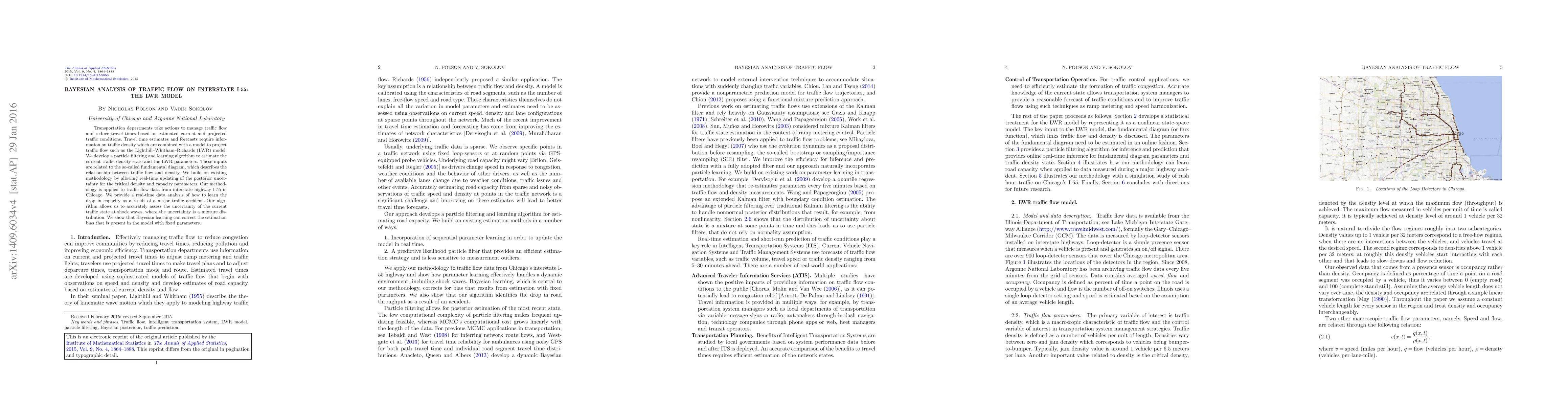 This paper develops a Bayesian particle filtering and learning algorithm to estimate real-time traffic density and parameters of the Lighthill-Whitham-Richards (LWR) model for interstate I-55. The method updates posterior uncertainty for critical density and capacity parameters, demonstrating improved accuracy and bias correction in traffic flow estimation post-accident.