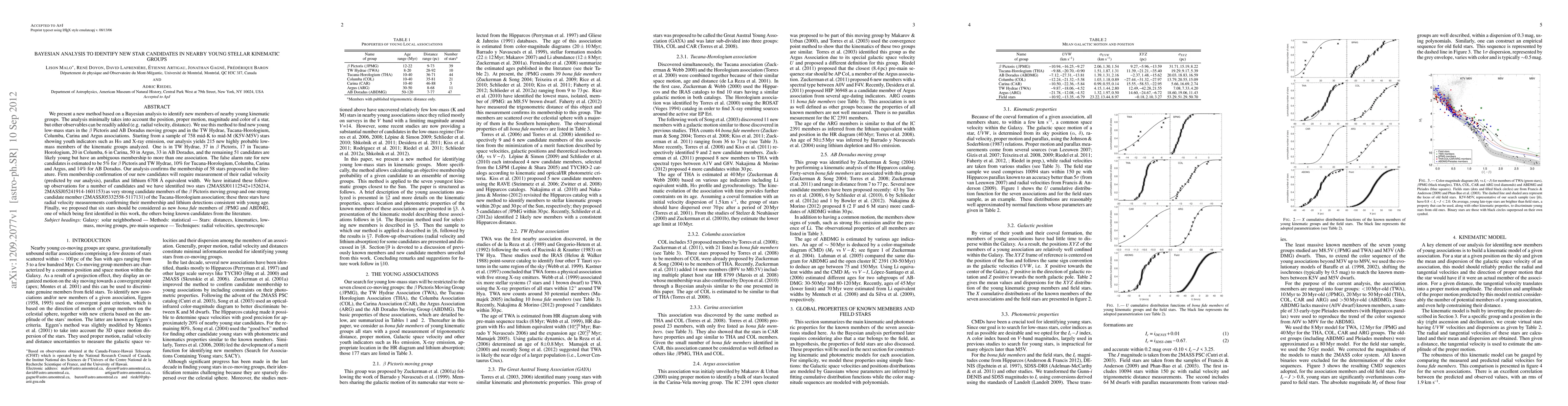 We present a new method based on a Bayesian analysis to identify new members of nearby young kinematic groups. The analysis minimally takes into account the position, proper motion, magnitude and color of a star, but other observables can be readily added (e.g. radial velocity, distance). We use this method to find new young low-mass stars in the \beta Pictoris (\beta PMG) and AB Doradus (ABDMG) moving groups and in the TW Hydrae (TWA), Tucana-Horologium (THA), Columba, Carina and Argus associations. Starting from a sample of 758 mid-KM (K5V-M5V) stars showing youth indicators such as H\alpha\ and X-ray emission, our analysis yields 215 new highly probable low-mass members of the kinematic groups analyzed. One is in TWA, 37 in \beta PMG, 17 in THA, 20 in Columba, 6 in Carina, 50 in Argus, 33 in ABDMG, and the remaining 51 candidates are likely young but have an ambiguous membership to more than one association. The false alarm rate for new candidates is estimated to be 5% for \beta PMG and TWA, 10% for THA, Columba, Carina and Argus, and 14% for ABDMG. Our analysis confirms the membership of 58 stars proposed in the literature. Firm membership confirmation of our new candidates will require measurement of their radial velocity (predicted by our analysis), parallax and lithium 6708 {\AA} equivalent width. We have initiated these follow-up observations for a number of candidates and we have identified two stars (2MASSJ0111+1526, 2MASSJ0524-1601) as very strong candidate members of the \beta PMG and one strong candidate member (2MASSJ0533-5117) of the THA; these three stars have radial velocity measurements confirming their membership and lithium detections consistent with young age. Finally, we proposed that six stars should be considered as new bona fide members of \beta PMG and ABDMG, one of which being first identified in this work, the others being known candidates from the literature.