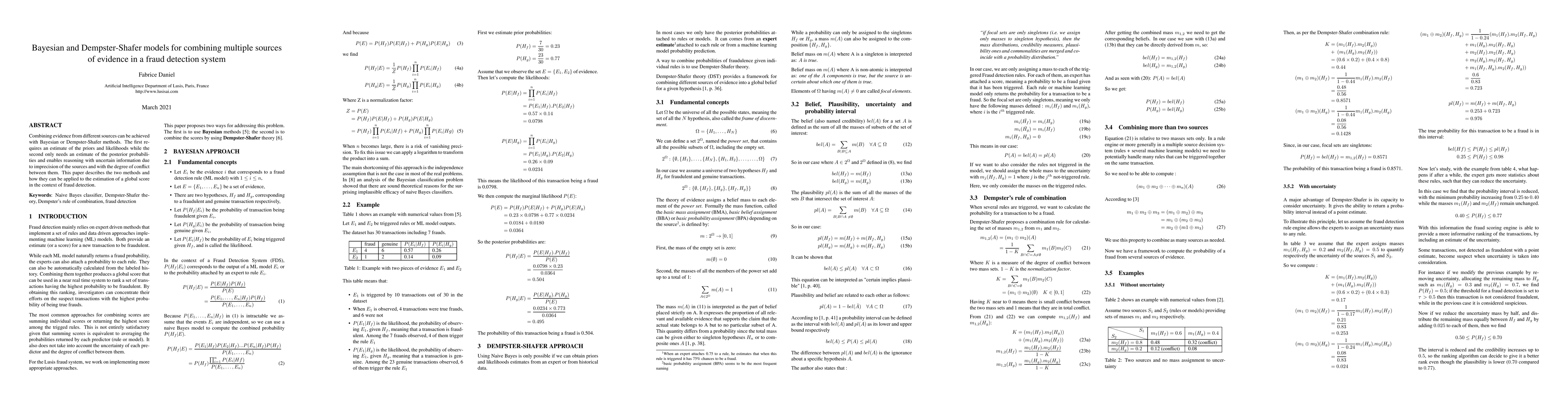 Combining evidence from different sources can be achieved with Bayesian or Dempster-Shafer methods. The first requires an estimate of the priors and likelihoods while the second only needs an estimate of the posterior probabilities and enables reasoning with uncertain information due to imprecision of the sources and with the degree of conflict between them. This paper describes the two methods and how they can be applied to the estimation of a global score in the context of fraud detection.