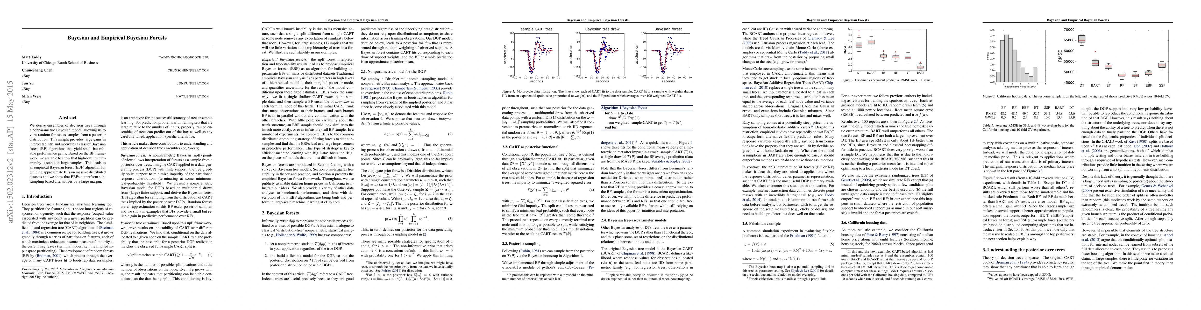 We derive ensembles of decision trees through a nonparametric Bayesian model, allowing us to view random forests as samples from a posterior distribution. This insight provides large gains in interpretability, and motivates a class of Bayesian forest (BF) algorithms that yield small but reliable performance gains. Based on the BF framework, we are able to show that high-level tree hierarchy is stable in large samples. This leads to an empirical Bayesian forest (EBF) algorithm for building approximate BFs on massive distributed datasets and we show that EBFs outperform sub-sampling based alternatives by a large margin.