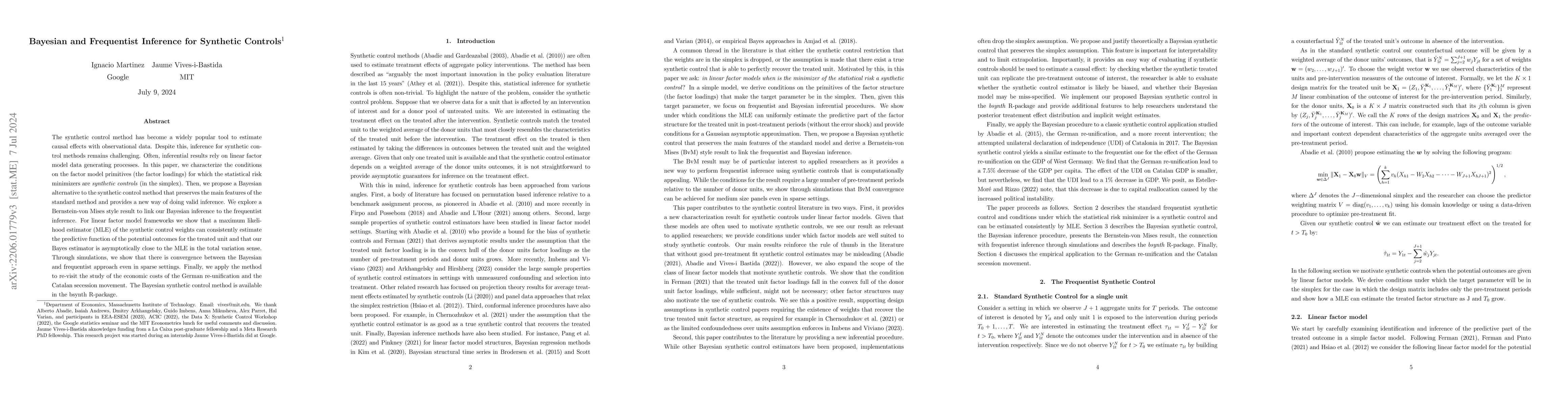 This paper proposes a Bayesian alternative to the synthetic control method for causal inference, demonstrating its consistency and convergence with frequentist methods through simulations and applications to historical economic events. The Bayesian approach provides a new framework for valid inference while maintaining the core features of the traditional synthetic control method.