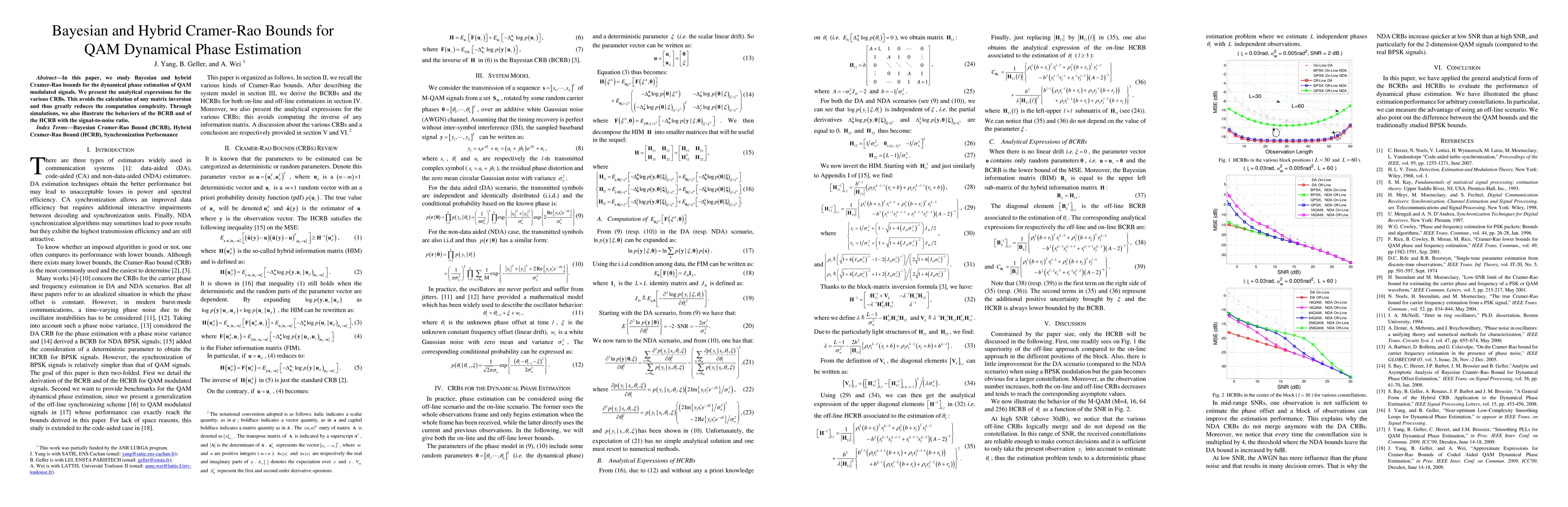 -In this paper, we study Bayesian and hybrid Cramer-Rao bounds for the dynamical phase estimation of QAM modulated signals. We present the analytical expressions for the various CRBs. This avoids the calculation of any matrix inversion and thus greatly reduces the computation complexity. Through simulations, we also illustrate the behaviors of the BCRB and of the HCRB with the signal-to-noise ratio. Index Terms-Bayesian Cramer-Rao Bound (BCRB), Hybrid Cramer-Rao Bound (HCRB), Synchronization Performance