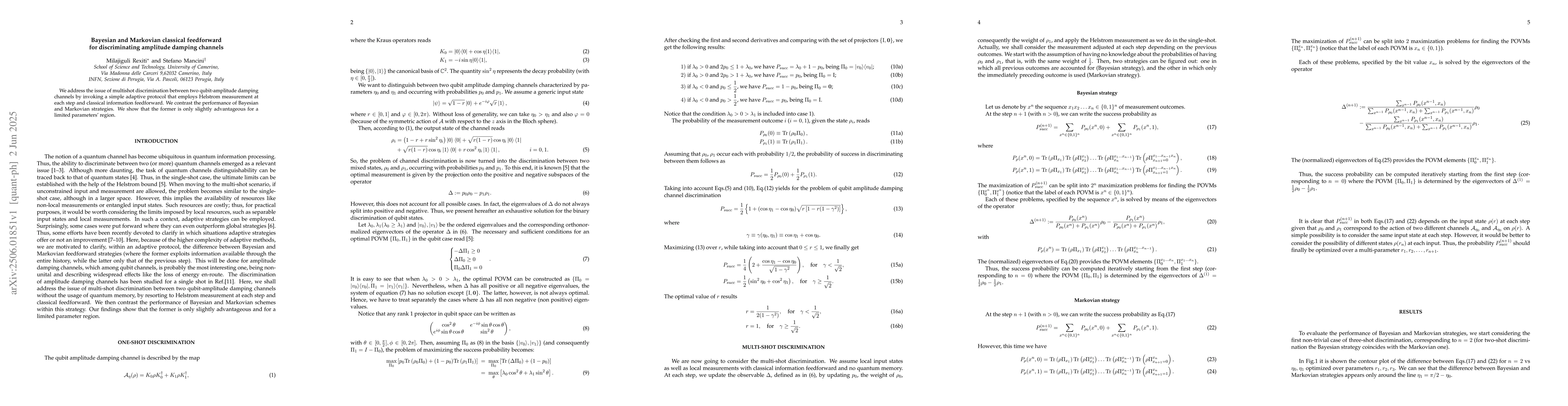 We address the issue of multishot discrimination between two qubit-amplitude damping channels by invoking a simple adaptive protocol that employs Helstrom measurement at each step and classical information feedforward. We contrast the performance of Bayesian and Markovian strategies. We show that the former is only slightly advantageous for a limited parameters' region.