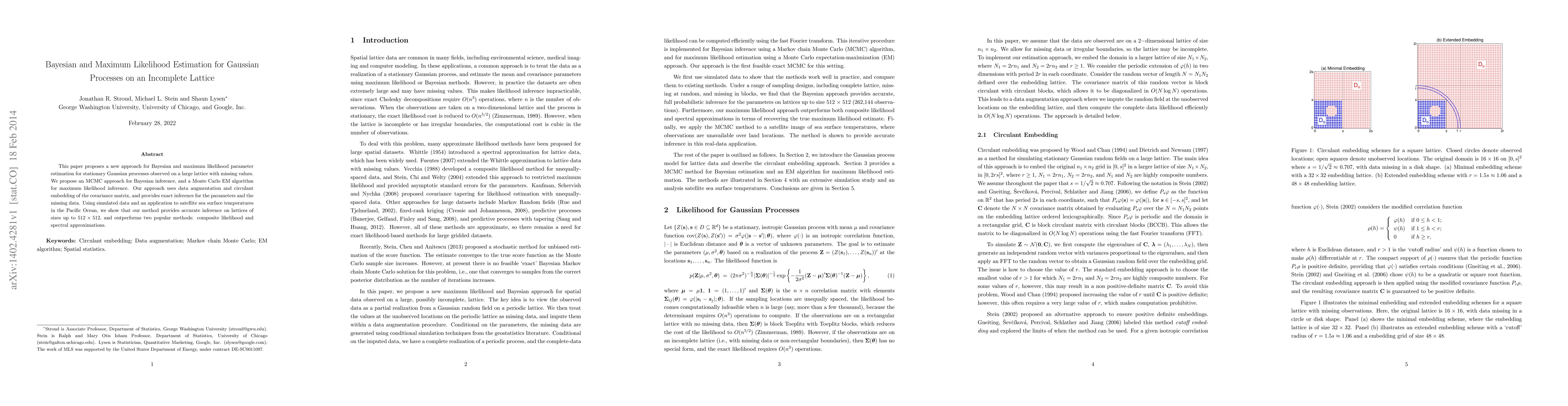 This paper introduces new methods for Bayesian and maximum likelihood estimation of Gaussian processes on incomplete lattices, employing MCMC for Bayesian inference and Monte Carlo EM for maximum likelihood. The approach leverages data augmentation and circulant embedding, demonstrating superior performance on large lattices compared to composite likelihood and spectral approximations.