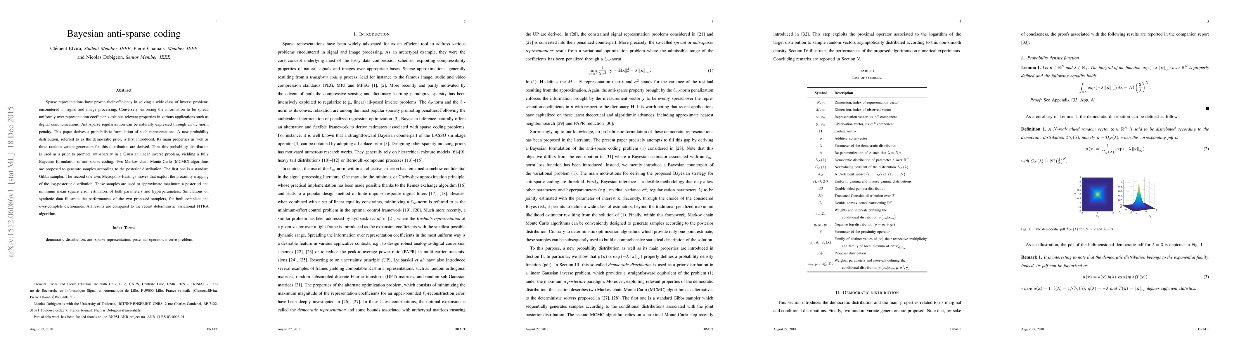 Sparse representations have proven their efficiency in solving a wide class of inverse problems encountered in signal and image processing. Conversely, enforcing the information to be spread uniformly over representation coefficients exhibits relevant properties in various applications such as digital communications. Anti-sparse regularization can be naturally expressed through an $\ell_{\infty}$-norm penalty. This paper derives a probabilistic formulation of such representations. A new probability distribution, referred to as the democratic prior, is first introduced. Its main properties as well as three random variate generators for this distribution are derived. Then this probability distribution is used as a prior to promote anti-sparsity in a Gaussian linear inverse problem, yielding a fully Bayesian formulation of anti-sparse coding. Two Markov chain Monte Carlo (MCMC) algorithms are proposed to generate samples according to the posterior distribution. The first one is a standard Gibbs sampler. The second one uses Metropolis-Hastings moves that exploit the proximity mapping of the log-posterior distribution. These samples are used to approximate maximum a posteriori and minimum mean square error estimators of both parameters and hyperparameters. Simulations on synthetic data illustrate the performances of the two proposed samplers, for both complete and over-complete dictionaries. All results are compared to the recent deterministic variational FITRA algorithm.