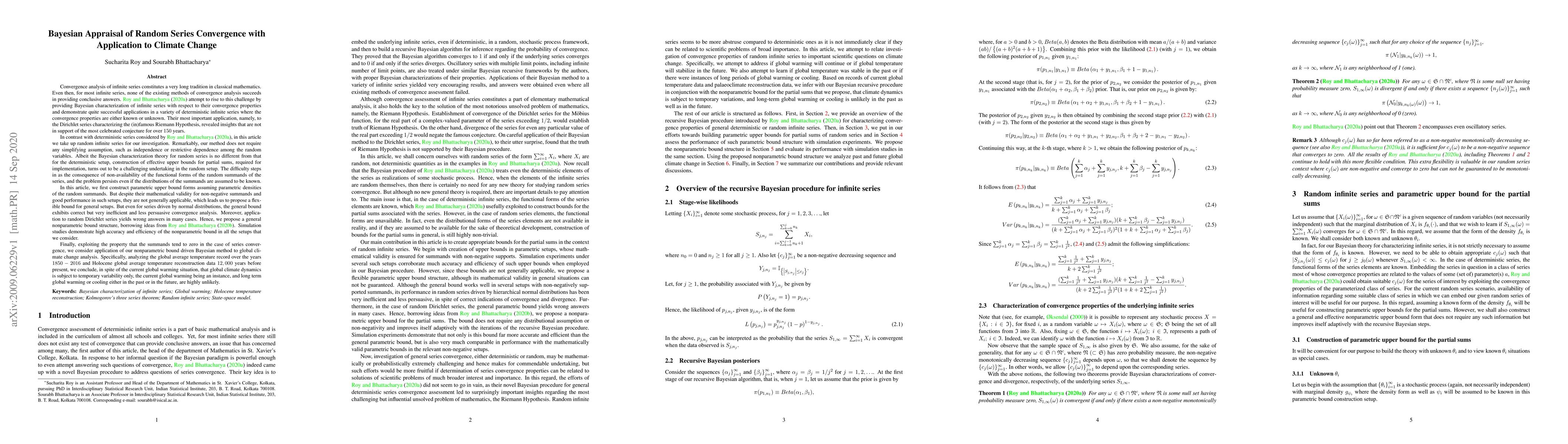 This paper develops Bayesian methods for assessing the convergence of random infinite series without simplifying assumptions. It constructs both parametric and nonparametric upper bounds for partial sums, demonstrating the superior accuracy and efficiency of the nonparametric approach through simulations. The method is applied to climate change analysis, concluding that long-term global warming or cooling trends are unlikely despite temporary variability like current global warming.