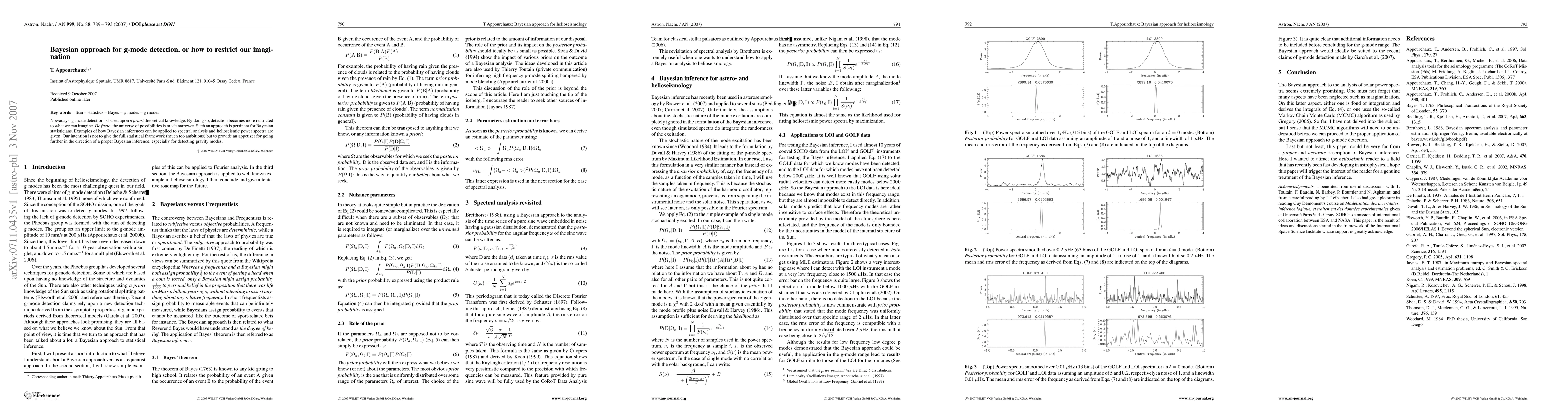 Nowadays, g-mode detection is based upon a priori theoretical knowledge. By doing so, detection becomes more restricted to what we can imagine. De facto, the universe of possibilities is made narrower. Such an approach is pertinent for Bayesian statisticians. Examples of how Bayesian inferences can be applied to spectral analysis and helioseismic power spectra are given. Our intention is not to give the full statistical framework (much too ambitious) but to provide an appetizer for going further in the direction of a proper Bayesian inference, especially for detecting gravity modes.
