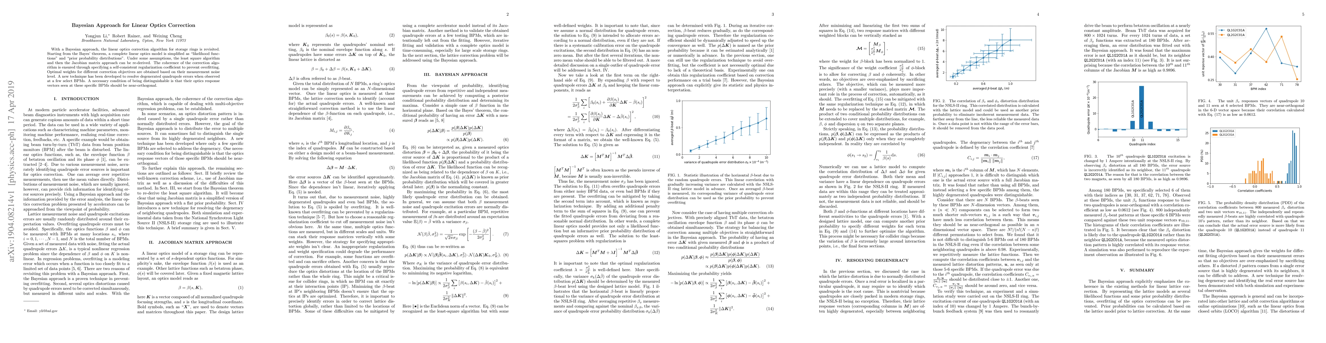 This paper presents a Bayesian approach to linear optics correction in storage rings, deriving traditional least square and Jacobian matrix methods. It introduces self-consistent regularization to prevent overfitting and optimal weight calculation based on noise levels. A technique to resolve degenerated quadrupole errors is also introduced, requiring near-orthogonal optics response vectors at specific BPMs.