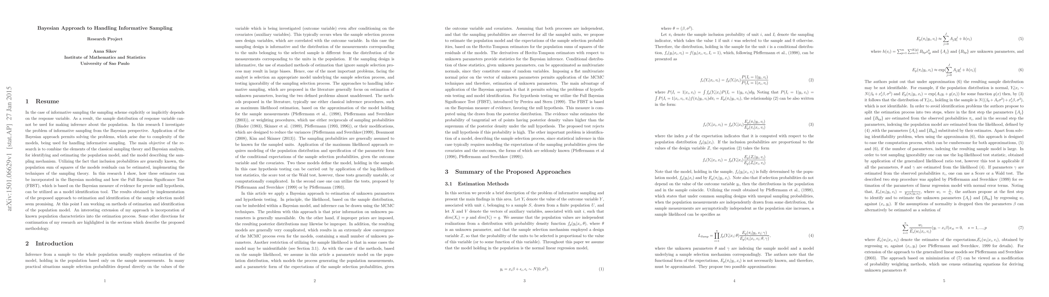 In the case of informative sampling the sampling scheme explicitly or implicitly depends on the response variable. As a result, the sample distribution of response variable can- not be used for making inference about the population. In this research I investigate the problem of informative sampling from the Bayesian perspective. Application of the Bayesian approach permits solving the problems, which arise due to complexity of the models, being used for handling informative sampling. The main objective of the re- search is to combine the elements of the classical sampling theory and Bayesian analysis, for identifying and estimating the population model, and the model describing the sam- pling mechanism. Utilizing the fact that inclusion probabilities are generally known, the population sum of squares of the models residuals can be estimated, implementing the techniques of the sampling theory. In this research I show, how these estimates can be incorporated in the Bayesian modeling and how the Full Bayesian Significance Test (FBST), which is based on the Bayesian measure of evidence for precise null hypothesis, can be utilized as a model identification tool. The results obtained by implementation of the proposed approach to estimation and identification of the sample selection model seem promising. At this point I am working on methods of estimation and identification of the population model. An interesting extension of my approach is incorporation of known population characteristics into the estimation process. Some other directions for continuation of my research are highlighted in the sections which describe the proposed methodology.