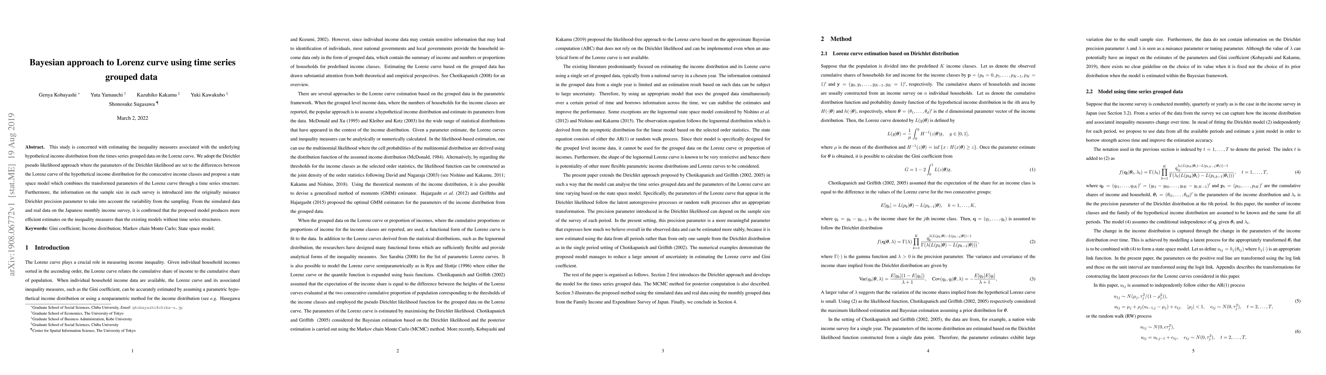 This study is concerned with estimating the inequality measures associated with the underlying hypothetical income distribution from the times series grouped data on the Lorenz curve. We adopt the Dirichlet pseudo likelihood approach where the parameters of the Dirichlet likelihood are set to the differences between the Lorenz curve of the hypothetical income distribution for the consecutive income classes and propose a state space model which combines the transformed parameters of the Lorenz curve through a time series structure. Furthermore, the information on the sample size in each survey is introduced into the originally nuisance Dirichlet precision parameter to take into account the variability from the sampling. From the simulated data and real data on the Japanese monthly income survey, it is confirmed that the proposed model produces more efficient estimates on the inequality measures than the existing models without time series structures.