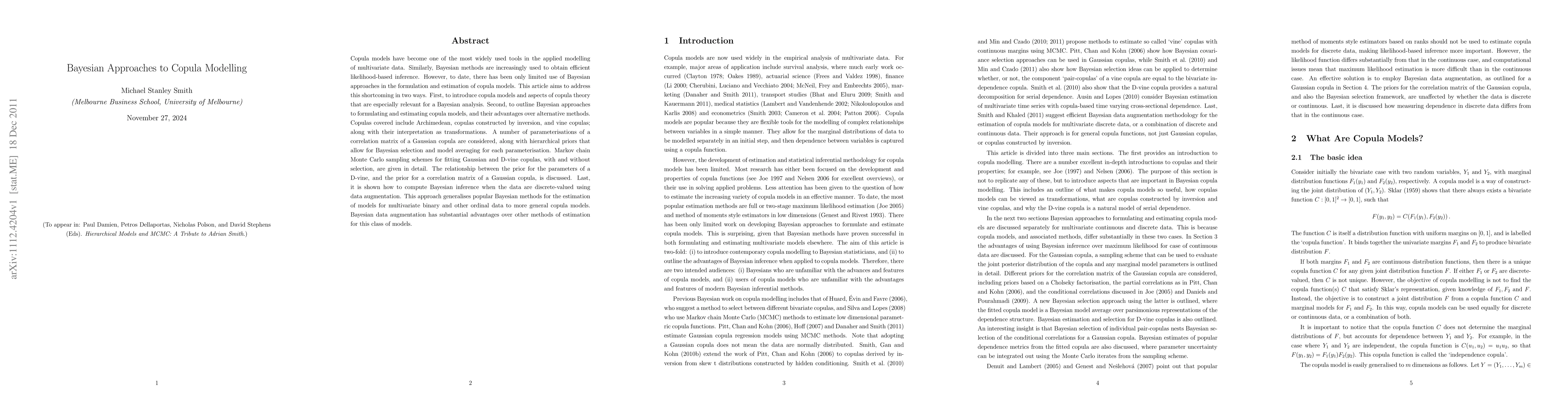 This paper introduces Bayesian methods for estimating copula models, focusing on Archimedean, inversion, and vine copulas. It discusses Markov chain Monte Carlo sampling schemes, hierarchical priors, and Bayesian data augmentation for discrete-valued data, highlighting advantages over alternative methods.