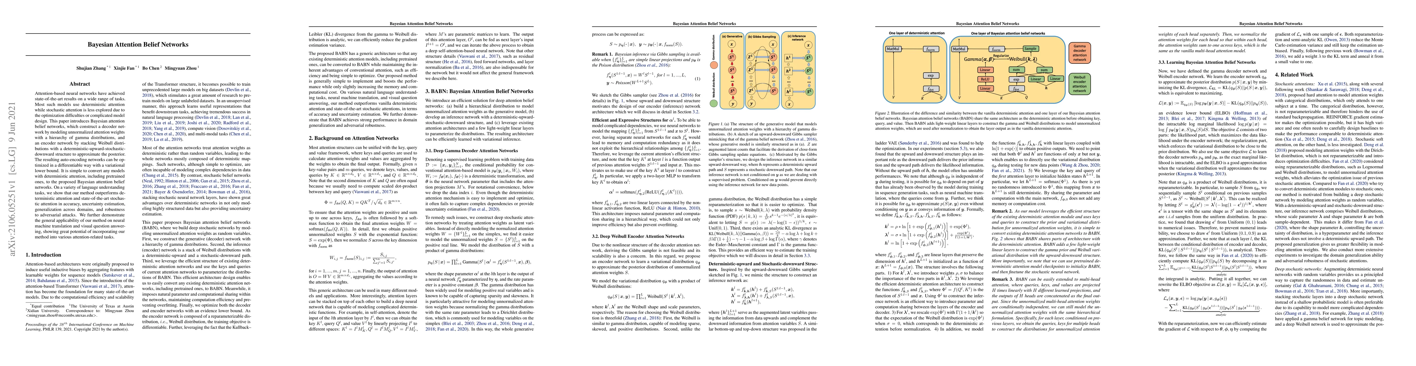 Attention-based neural networks have achieved state-of-the-art results on a wide range of tasks. Most such models use deterministic attention while stochastic attention is less explored due to the optimization difficulties or complicated model design. This paper introduces Bayesian attention belief networks, which construct a decoder network by modeling unnormalized attention weights with a hierarchy of gamma distributions, and an encoder network by stacking Weibull distributions with a deterministic-upward-stochastic-downward structure to approximate the posterior. The resulting auto-encoding networks can be optimized in a differentiable way with a variational lower bound. It is simple to convert any models with deterministic attention, including pretrained ones, to the proposed Bayesian attention belief networks. On a variety of language understanding tasks, we show that our method outperforms deterministic attention and state-of-the-art stochastic attention in accuracy, uncertainty estimation, generalization across domains, and robustness to adversarial attacks. We further demonstrate the general applicability of our method on neural machine translation and visual question answering, showing great potential of incorporating our method into various attention-related tasks.