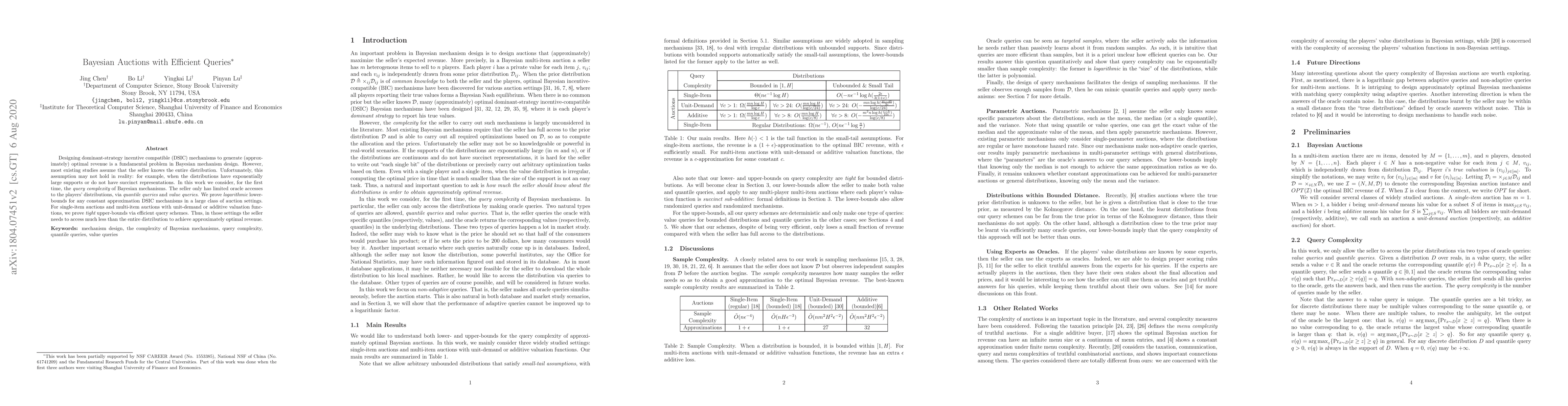 Generating good revenue is one of the most important problems in Bayesian auction design, and many (approximately) optimal dominant-strategy incentive compatible (DSIC) Bayesian mechanisms have been constructed for various auction settings. However, most existing studies do not consider the complexity for the seller to carry out the mechanism. It is assumed that the seller knows "each single bit" of the distributions and is able to optimize perfectly based on the entire distributions. Unfortunately, this is a strong assumption and may not hold in reality: for example, when the value distributions have exponentially large supports or do not have succinct representations. In this work we consider, for the first time, the query complexity of Bayesian mechanisms. We only allow the seller to have limited oracle accesses to the players' value distributions, via quantile queries and value queries. For a large class of auction settings, we prove logarithmic lower-bounds for the query complexity for any DSIC Bayesian mechanism to be of any constant approximation to the optimal revenue. For single-item auctions and multi-item auctions with unit-demand or additive valuation functions, we prove tight upper-bounds via efficient query schemes, without requiring the distributions to be regular or have monotone hazard rate. Thus, in those auction settings the seller needs to access much less than the full distributions in order to achieve approximately optimal revenue.