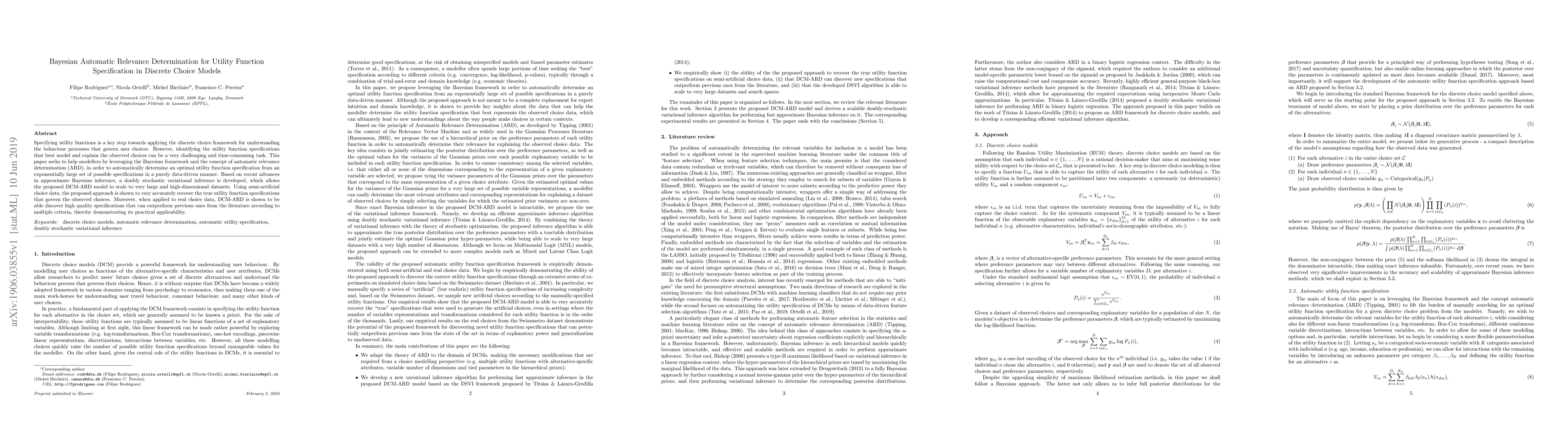 Specifying utility functions is a key step towards applying the discrete choice framework for understanding the behaviour processes that govern user choices. However, identifying the utility function specifications that best model and explain the observed choices can be a very challenging and time-consuming task. This paper seeks to help modellers by leveraging the Bayesian framework and the concept of automatic relevance determination (ARD), in order to automatically determine an optimal utility function specification from an exponentially large set of possible specifications in a purely data-driven manner. Based on recent advances in approximate Bayesian inference, a doubly stochastic variational inference is developed, which allows the proposed DCM-ARD model to scale to very large and high-dimensional datasets. Using semi-artificial choice data, the proposed approach is shown to very accurately recover the true utility function specifications that govern the observed choices. Moreover, when applied to real choice data, DCM-ARD is shown to be able discover high quality specifications that can outperform previous ones from the literature according to multiple criteria, thereby demonstrating its practical applicability.