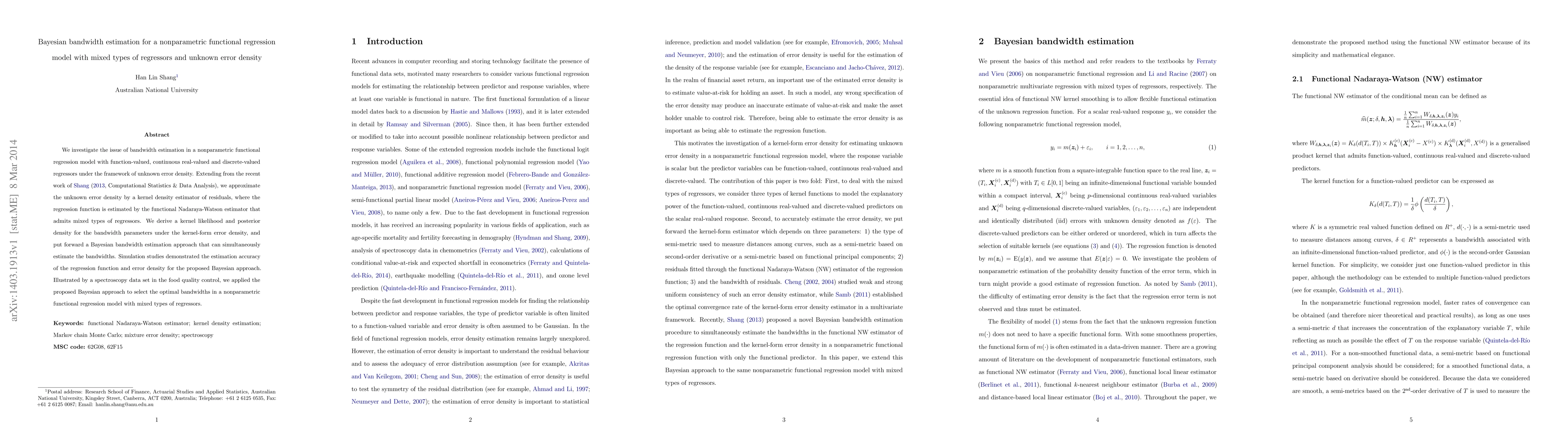 This paper proposes a Bayesian bandwidth estimation method for a nonparametric functional regression model accommodating mixed types of regressors and an unknown error density. The method uses a kernel likelihood and posterior density for bandwidth parameters, demonstrated through simulations and applied to a spectroscopy dataset for food quality control.