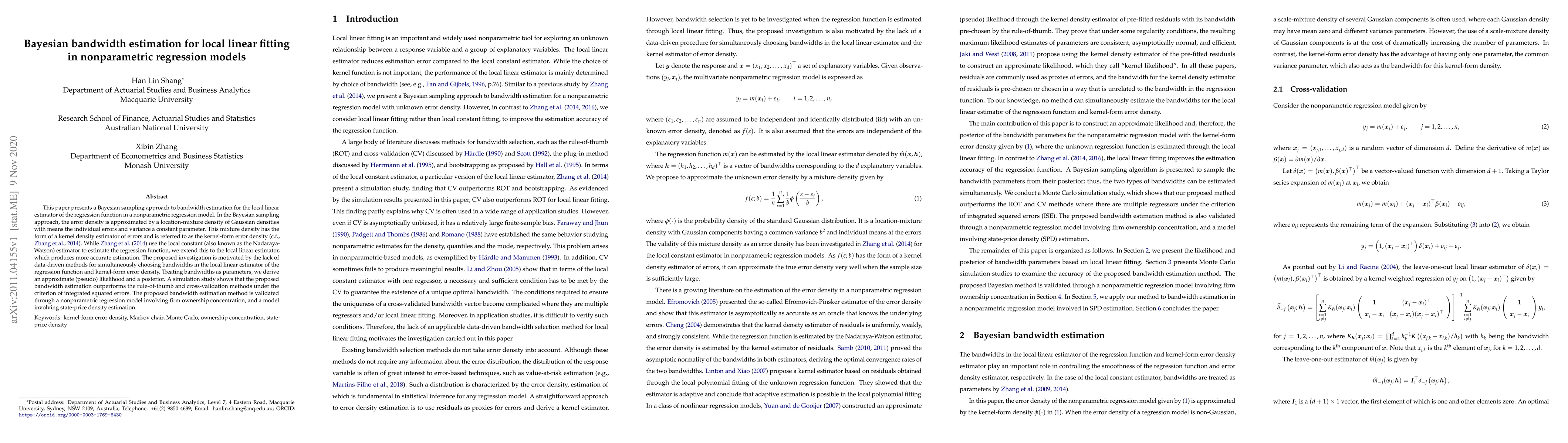 This paper proposes a Bayesian sampling approach for bandwidth estimation in local linear nonparametric regression models, extending the kernel-form error density method to improve accuracy. The method outperforms traditional methods in simulations and is validated through applications involving firm ownership concentration and state-price density estimation.