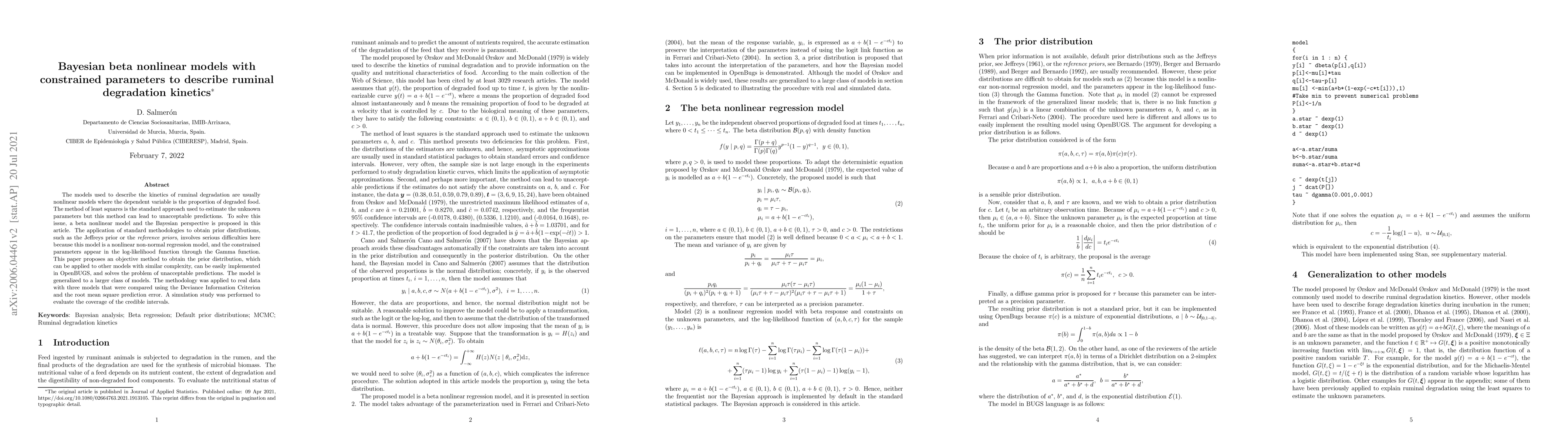 The models used to describe the kinetics of ruminal degradation are usually nonlinear models where the dependent variable is the proportion of degraded food. The method of least squares is the standard approach used to estimate the unknown parameters but this method can lead to unacceptable predictions. To solve this issue, a beta nonlinear model and the Bayesian perspective is proposed in this article. The application of standard methodologies to obtain prior distributions, such as the Jeffreys prior or the reference priors, involves serious difficulties here because this model is a nonlinear non-normal regression model, and the constrained parameters appear in the log-likelihood function through the Gamma function. This paper proposes an objective method to obtain the prior distribution, which can be applied to other models with similar complexity, can be easily implemented in OpenBUGS, and solves the problem of unacceptable predictions. The model is generalized to a larger class of models. The methodology was applied to real data with three models that were compared using the Deviance Information Criterion and the root mean square prediction error. A simulation study was performed to evaluate the coverage of the credible intervals.