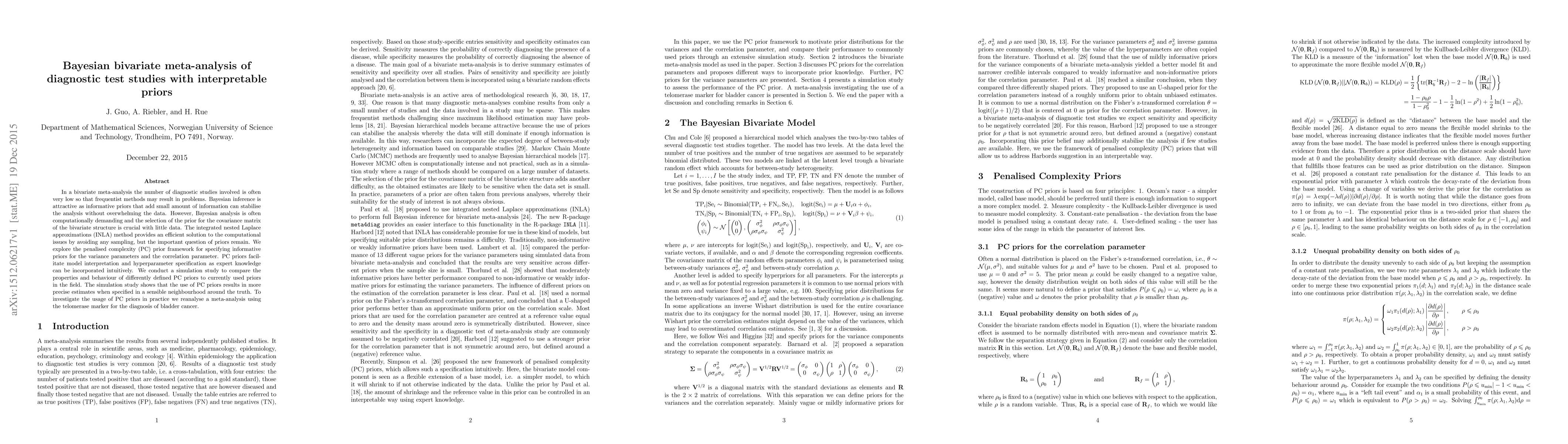 The paper proposes a Bayesian bivariate meta-analysis using the INLA method for diagnostic test studies, employing penalized complexity (PC) priors for variance and correlation parameters to stabilize analysis with limited data.