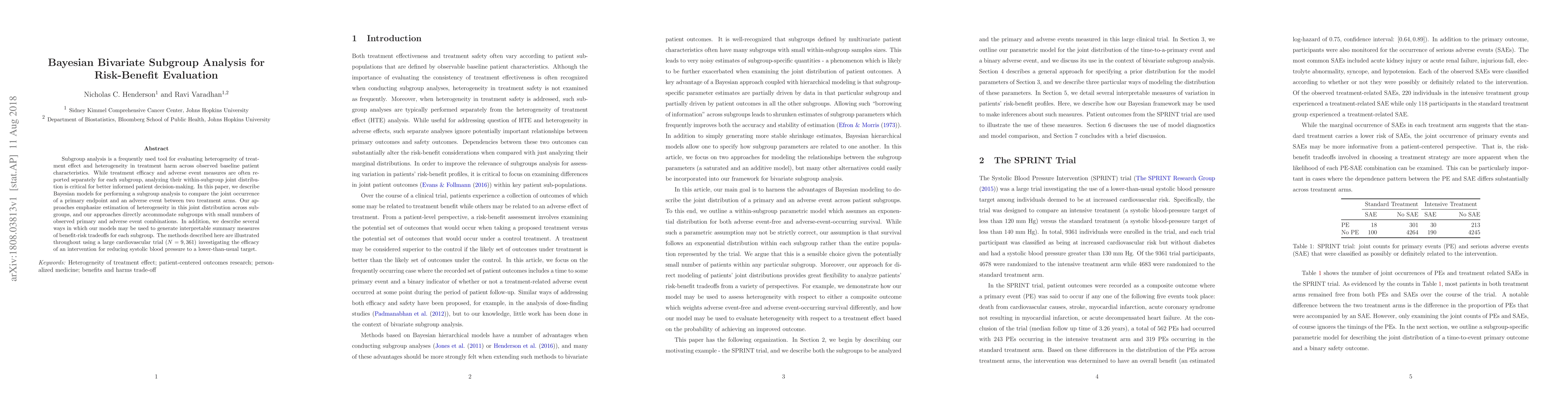 This paper proposes Bayesian models for subgroup analysis to jointly evaluate treatment efficacy and adverse event risks, emphasizing heterogeneity across patient characteristics and accommodating small subgroup sizes. The methods are demonstrated using a cardiovascular trial to assess benefit-risk tradeoffs.