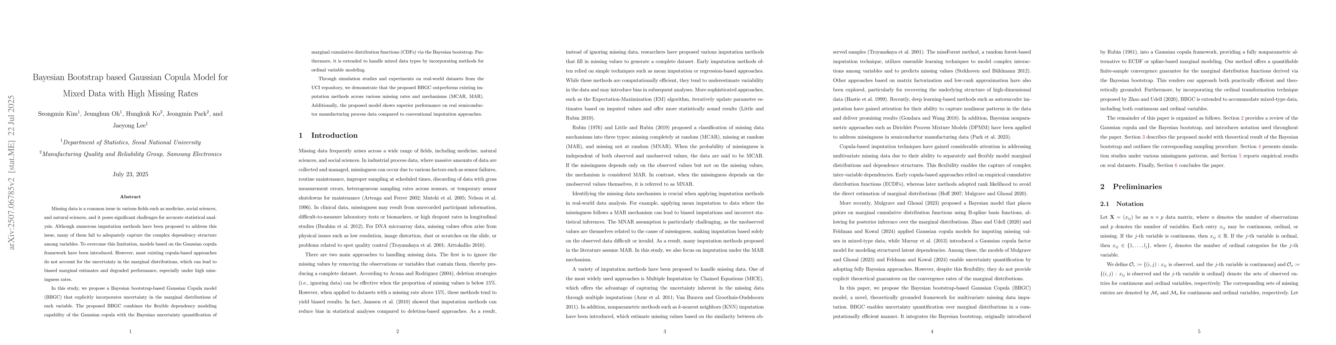 Missing data is a common issue in various fields such as medicine, social sciences, and natural sciences, and it poses significant challenges for accurate statistical analysis. Although numerous imputation methods have been proposed to address this issue, many of them fail to adequately capture the complex dependency structure among variables. To overcome this limitation, models based on the Gaussian copula framework have been introduced. However, most existing copula-based approaches do not account for the uncertainty in the marginal distributions, which can lead to biased marginal estimates and degraded performance, especially under high missingness rates. In this study, we propose a Bayesian bootstrap-based Gaussian Copula model (BBGC) that explicitly incorporates uncertainty in the marginal distributions of each variable. The proposed BBGC combines the flexible dependency modeling capability of the Gaussian copula with the Bayesian uncertainty quantification of marginal cumulative distribution functions (CDFs) via the Bayesian bootstrap. Furthermore, it is extended to handle mixed data types by incorporating methods for ordinal variable modeling. Through simulation studies and experiments on real-world datasets from the UCI repository, we demonstrate that the proposed BBGC outperforms existing imputation methods across various missing rates and mechanisms (MCAR, MAR). Additionally, the proposed model shows superior performance on real semiconductor manufacturing process data compared to conventional imputation approaches.