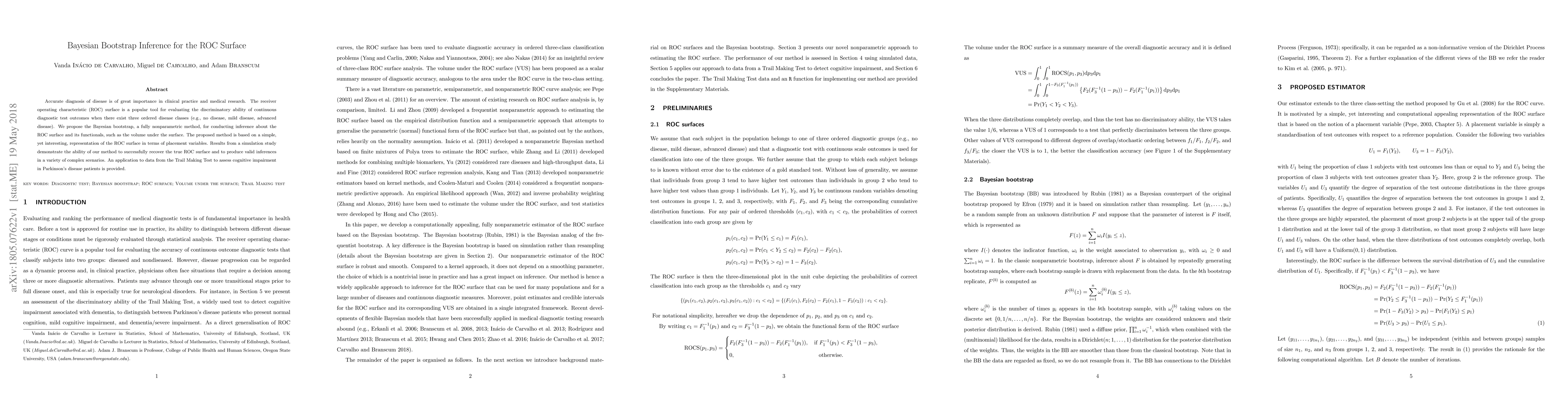The paper proposes a Bayesian bootstrap method for inference on the ROC surface, utilizing a representation in terms of placement variables. It demonstrates the method's effectiveness through a simulation study and an application to Parkinson's disease data.