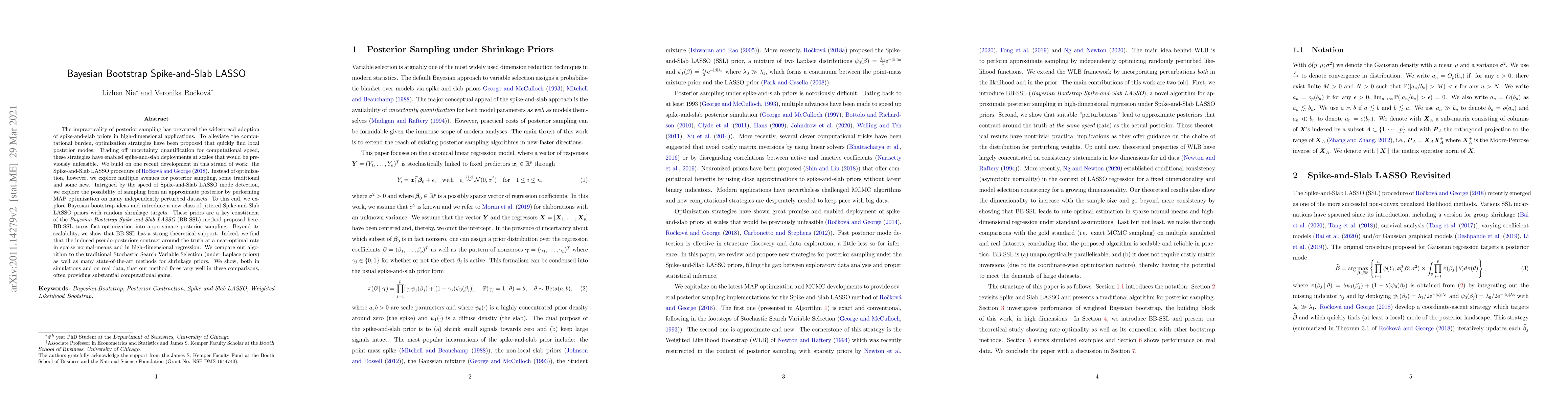 The impracticality of posterior sampling has prevented the widespread adoption of spike-and-slab priors in high-dimensional applications. To alleviate the computational burden, optimization strategies have been proposed that quickly find local posterior modes. Trading off uncertainty quantification for computational speed, these strategies have enabled spike-and-slab deployments at scales that would be previously unfeasible. We build on one recent development in this strand of work: the Spike-and-Slab LASSO procedure of Ro\v{c}kov\'{a} and George (2018). Instead of optimization, however, we explore multiple avenues for posterior sampling, some traditional and some new. Intrigued by the speed of Spike-and-Slab LASSO mode detection, we explore the possibility of sampling from an approximate posterior by performing MAP optimization on many independently perturbed datasets. To this end, we explore Bayesian bootstrap ideas and introduce a new class of jittered Spike-and-Slab LASSO priors with random shrinkage targets. These priors are a key constituent of the Bayesian Bootstrap Spike-and-Slab LASSO (BB-SSL) method proposed here. BB-SSL turns fast optimization into approximate posterior sampling. Beyond its scalability, we show that BB-SSL has a strong theoretical support. Indeed, we find that the induced pseudo-posteriors contract around the truth at a near-optimal rate in sparse normal-means and in high-dimensional regression. We compare our algorithm to the traditional Stochastic Search Variable Selection (under Laplace priors) as well as many state-of-the-art methods for shrinkage priors. We show, both in simulations and on real data, that our method fares superbly in these comparisons, often providing substantial computational gains.