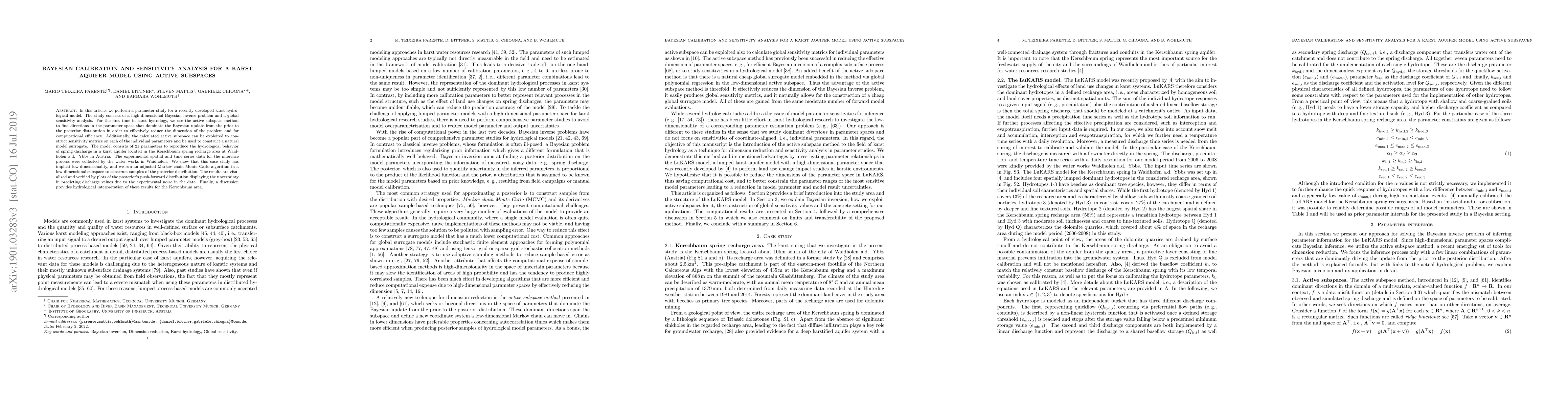 This paper conducts a Bayesian calibration and sensitivity analysis for a karst aquifer model using the active subspace method to reduce dimensionality and improve computational efficiency. The study focuses on a 21-parameter model for spring discharge in the Kerschbaum spring area, Austria, and demonstrates the method's effectiveness in capturing the essential variability in the posterior distribution.