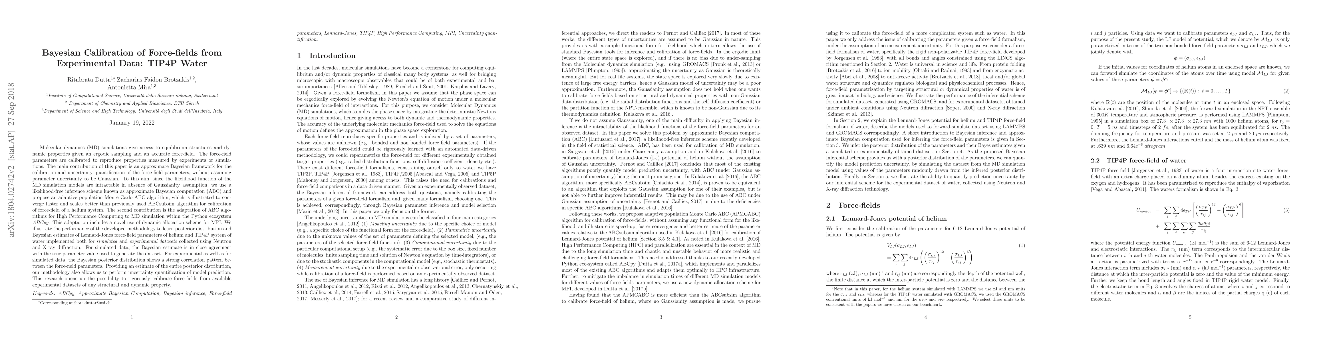 Molecular dynamics (MD) simulations give access to equilibrium structures and dynamic properties given an ergodic sampling and an accurate force-field. The force-field parameters are calibrated to reproduce properties measured by experiments or simulations. The main contribution of this paper is an approximate Bayesian framework for the calibration and uncertainty quantification of the force-field parameters, without assuming parameter uncertainty to be Gaussian. To this aim, since the likelihood function of the MD simulation models are intractable in absence of Gaussianity assumption, we use a likelihood-free inference scheme known as approximate Bayesian computation (ABC) and propose an adaptive population Monte Carlo ABC algorithm, which is illustrated to converge faster and scales better than previously used ABCsubsim algorithm for calibration of force-field of a helium system. The second contribution is the adaptation of ABC algorithms for High Performance Computing to MD simulation within the Python ecosystem ABCpy. We illustrate the performance of the developed methodology to learn posterior distribution and Bayesian estimates of Lennard-Jones force-field parameters of helium and TIP4P system of water implemented both for simulated and experimental datasets collected using Neutron and X-ray diffraction. For simulated data, the Bayesian estimate is in close agreement with the true parameter value used to generate the dataset. For experimental as well as for simulated data, the Bayesian posterior distribution shows a strong correlation pattern between the force-field parameters. Providing an estimate of the entire posterior distribution, our methodology also allows us to perform uncertainty quantification of model prediction. This research opens up the possibility to rigorously calibrate force-fields from available experimental datasets of any structural and dynamic property.