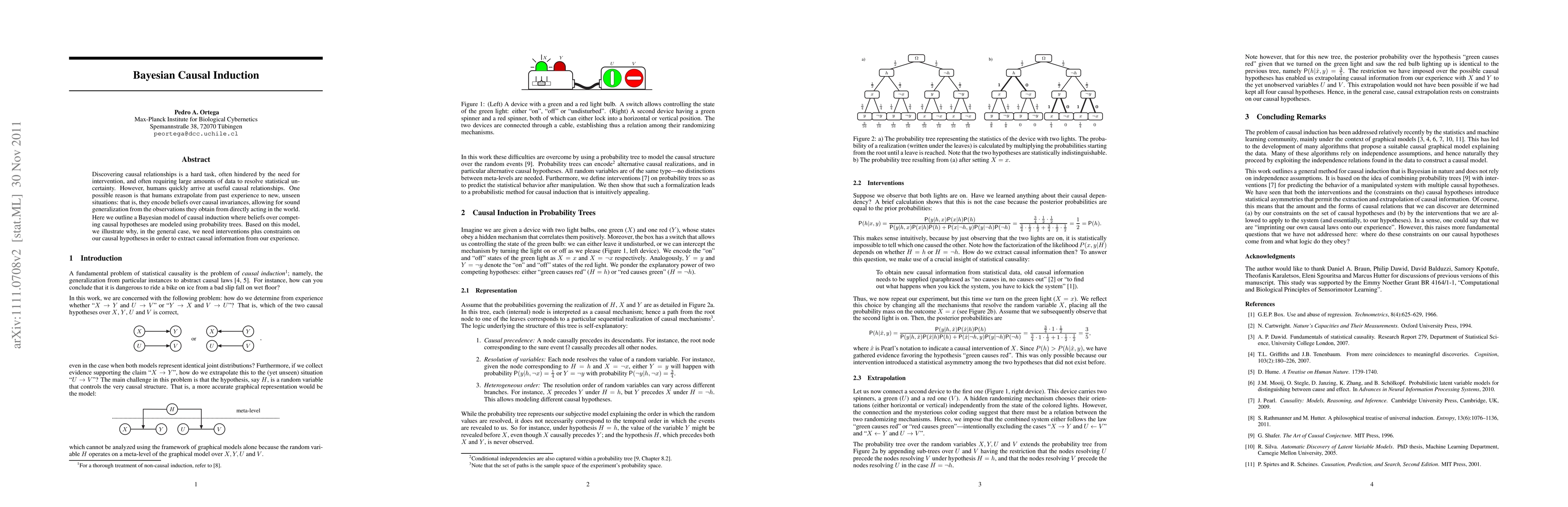 This research paper proposes a Bayesian model for causal induction that uses probability trees to represent beliefs over competing hypotheses, highlighting the need for interventions and constraints to extract causal information from experience.
