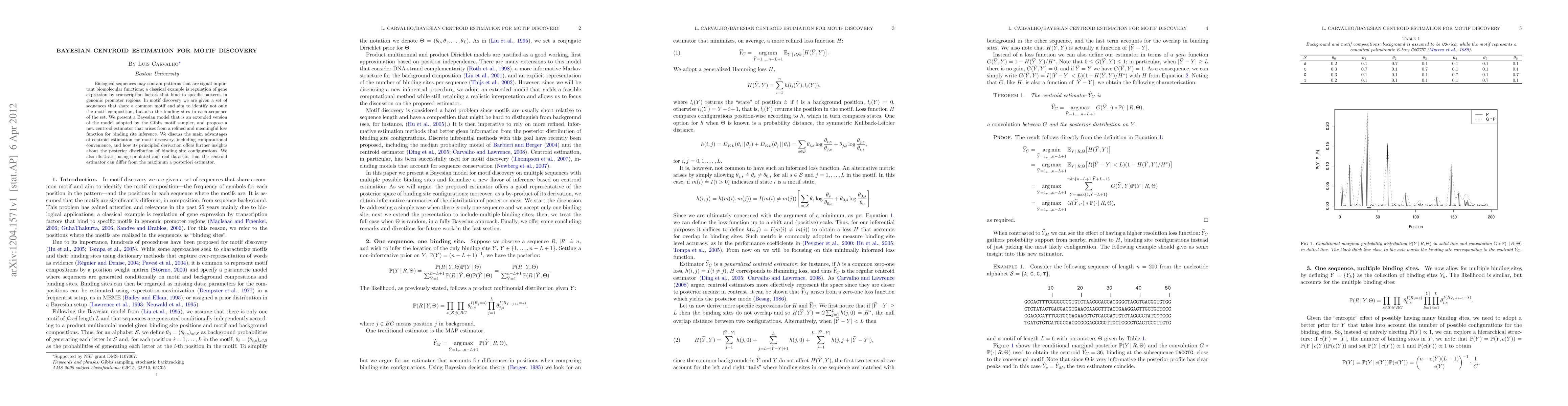This paper proposes a Bayesian centroid estimation method for motif discovery in biological sequences, extending the Gibbs motif sampler. It introduces a new centroid estimator derived from a refined loss function, highlighting its advantages for computational efficiency and insights into the posterior distribution of binding site configurations.